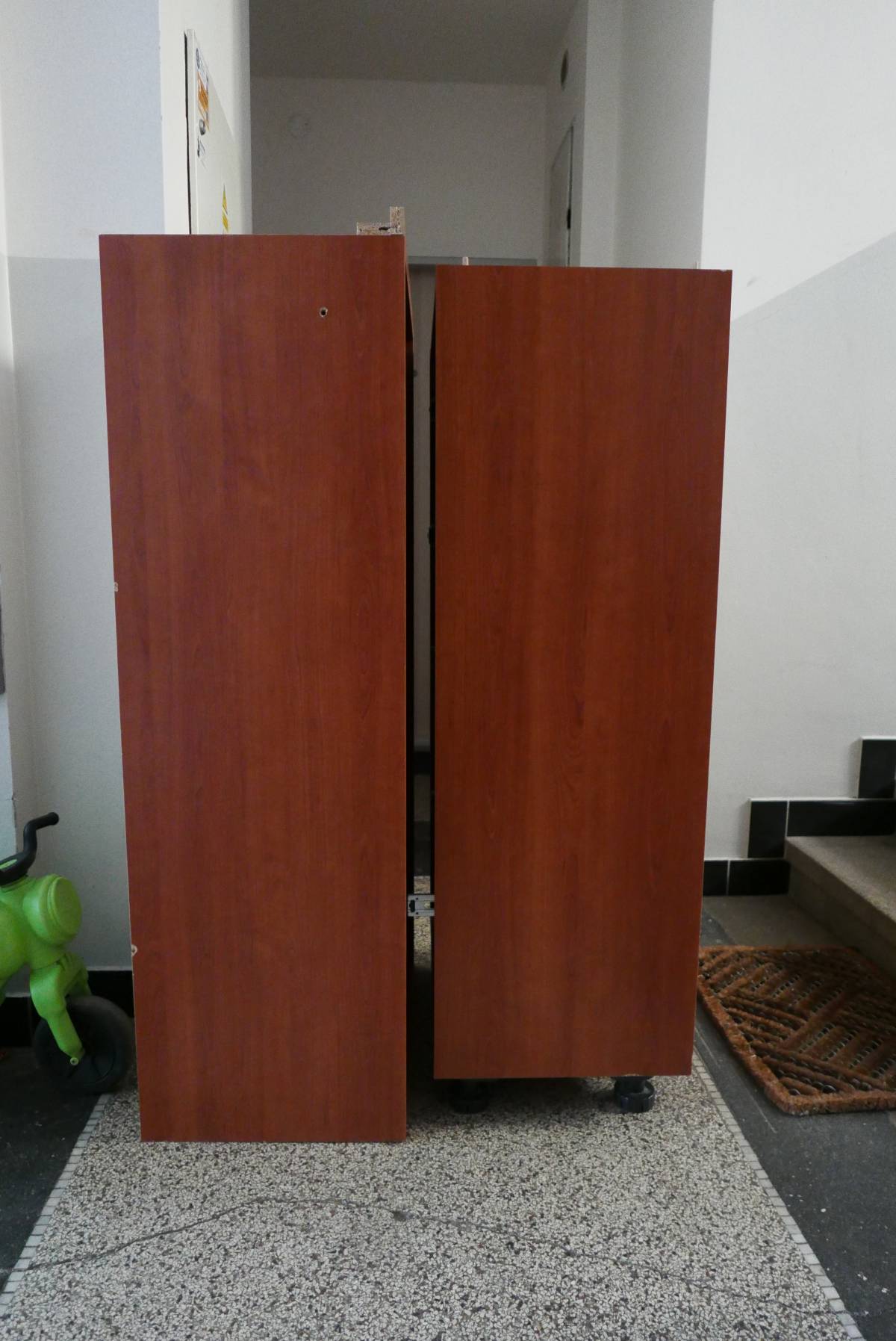 Skříň je v současnosti rozložená na dva díly + šuplíky + přední dvířka.
