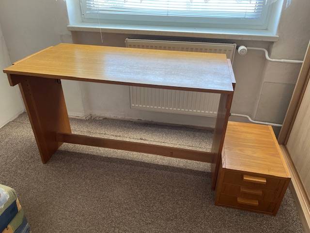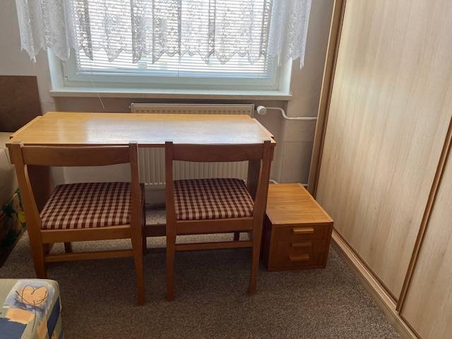 Daruji za odvoz starší, výškově nastavitelný stůl, s šuplíky i židlemi. Rozměry š 59 x d122 x v až 74 cm.