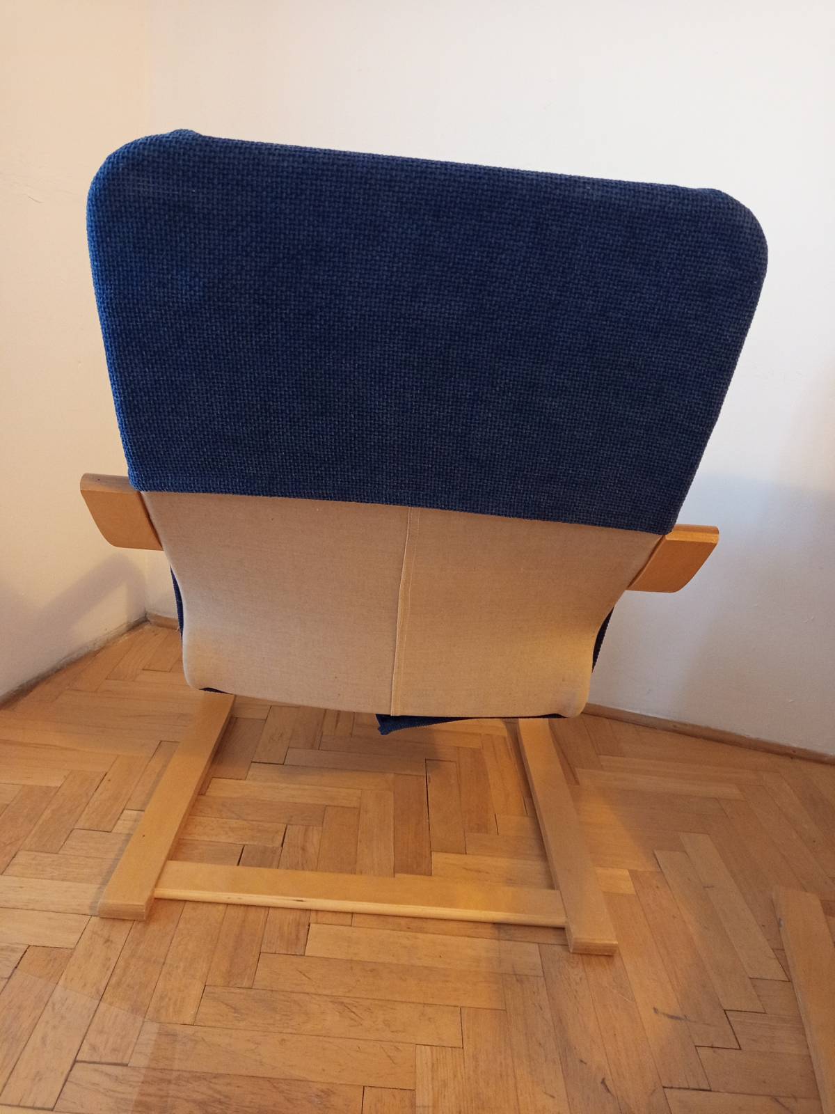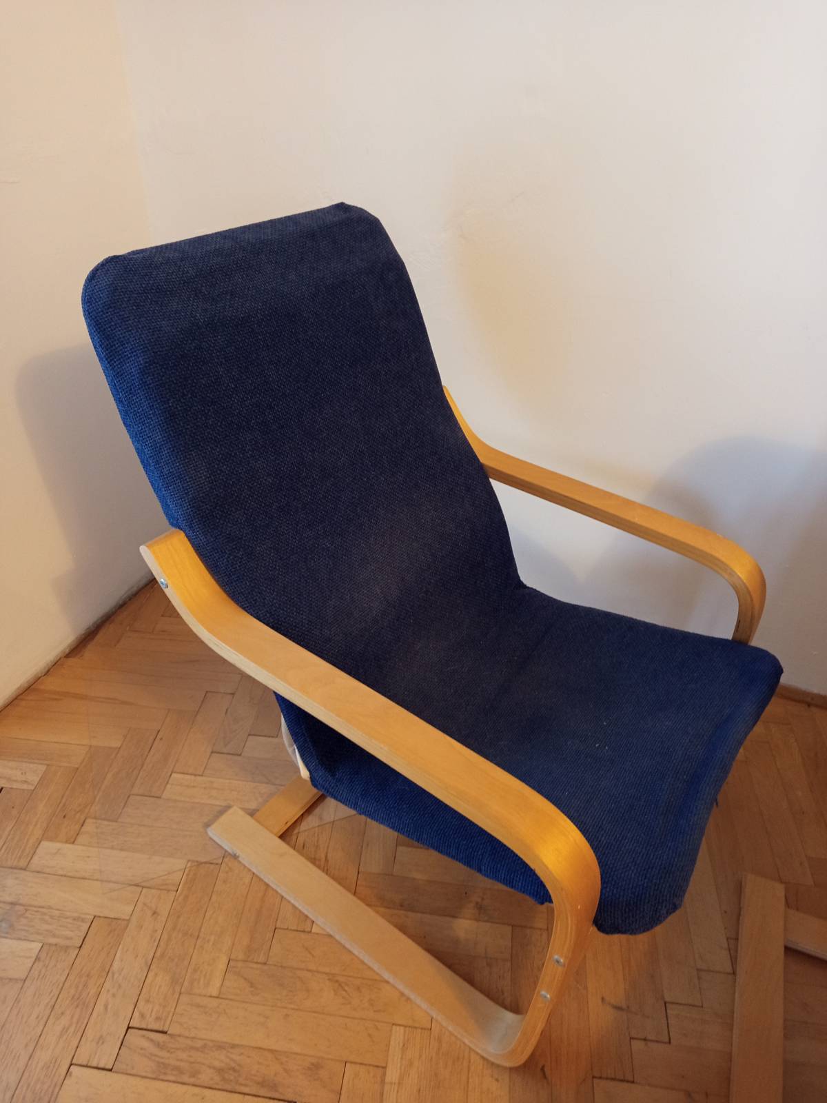 Materiál dýha. Křesla mají původní bílý potah na který je ušitý modrý odnímatelný potah.