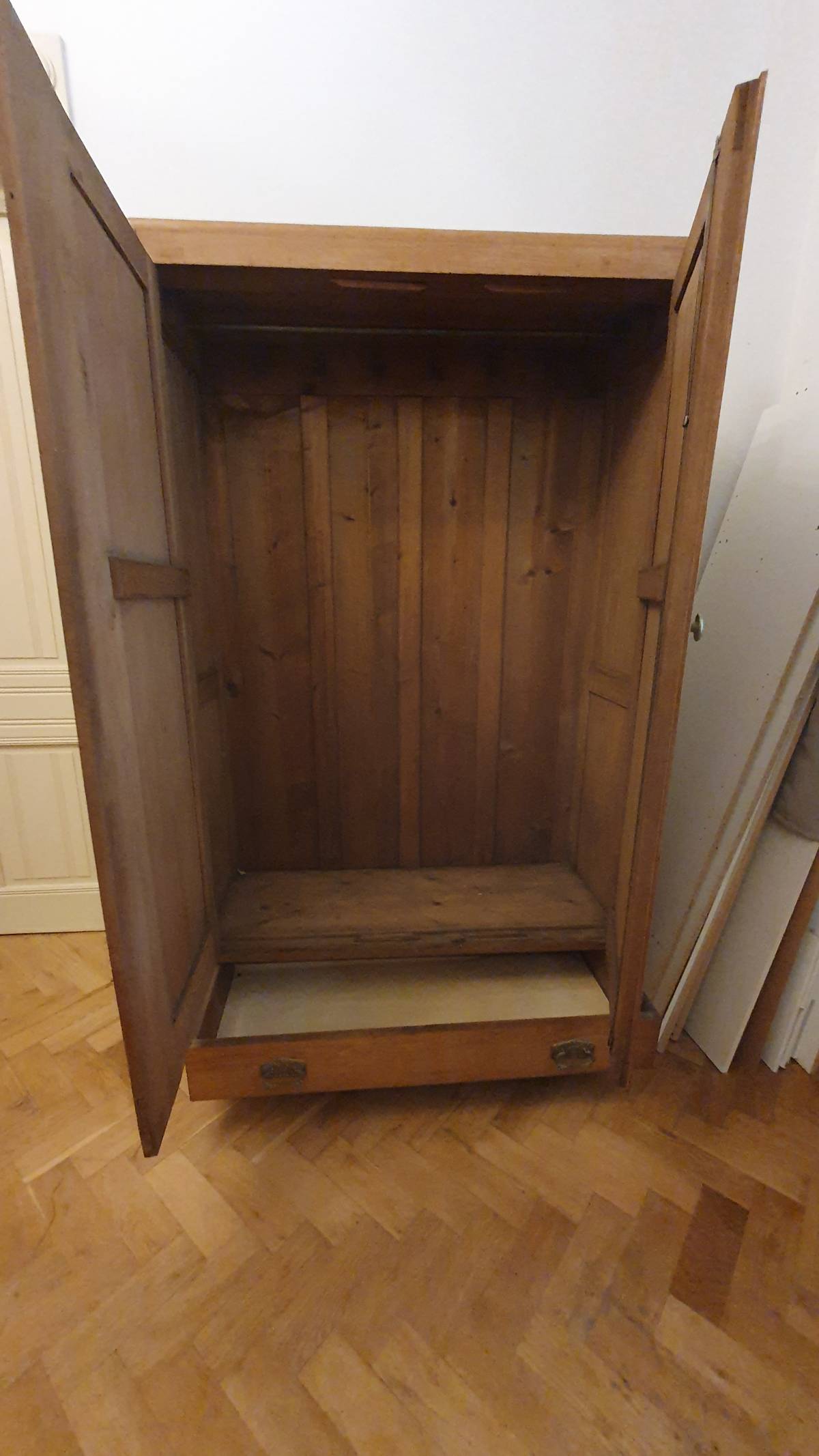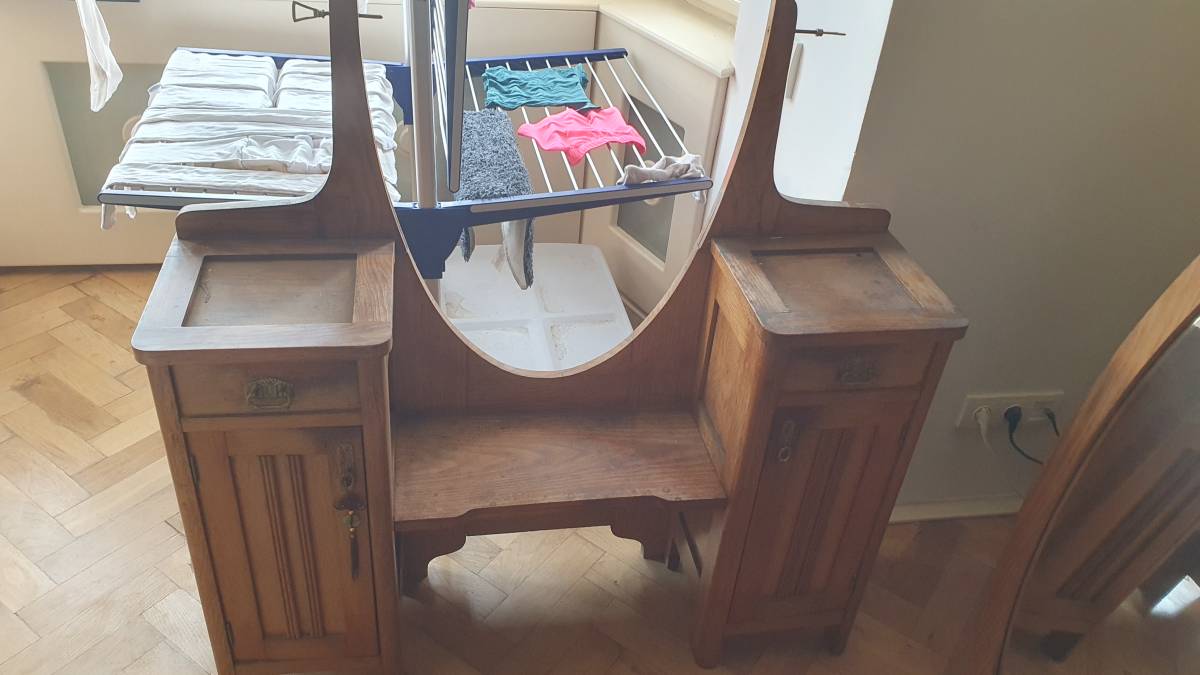 Daruji za odvoz sadu starého (historického) nábytek. Možno vyzvednout v bytě v druhém patře pouze s osobním výtahem (skříň se asi nevejde). Součástí jsou dvě stejné šatní skříně, dva noční stolky (bez kamenného povrchu) a jeden toaletní stolek se zrcadlem.