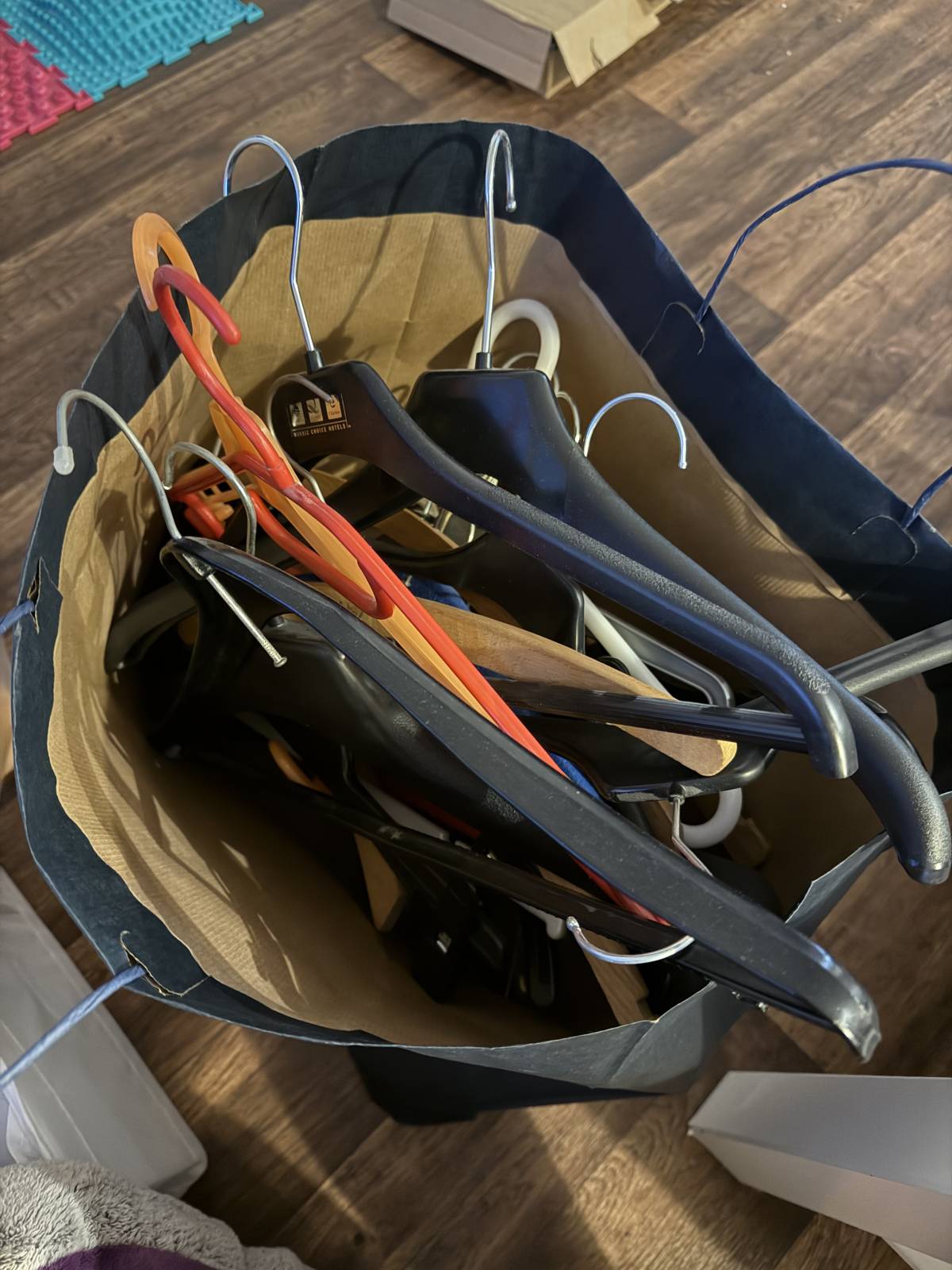 Daruji za odvoz tašku plnou různých ramínek. Vyzvednutí na Praze 13 (mezi metry Hůrka a Lužiny).