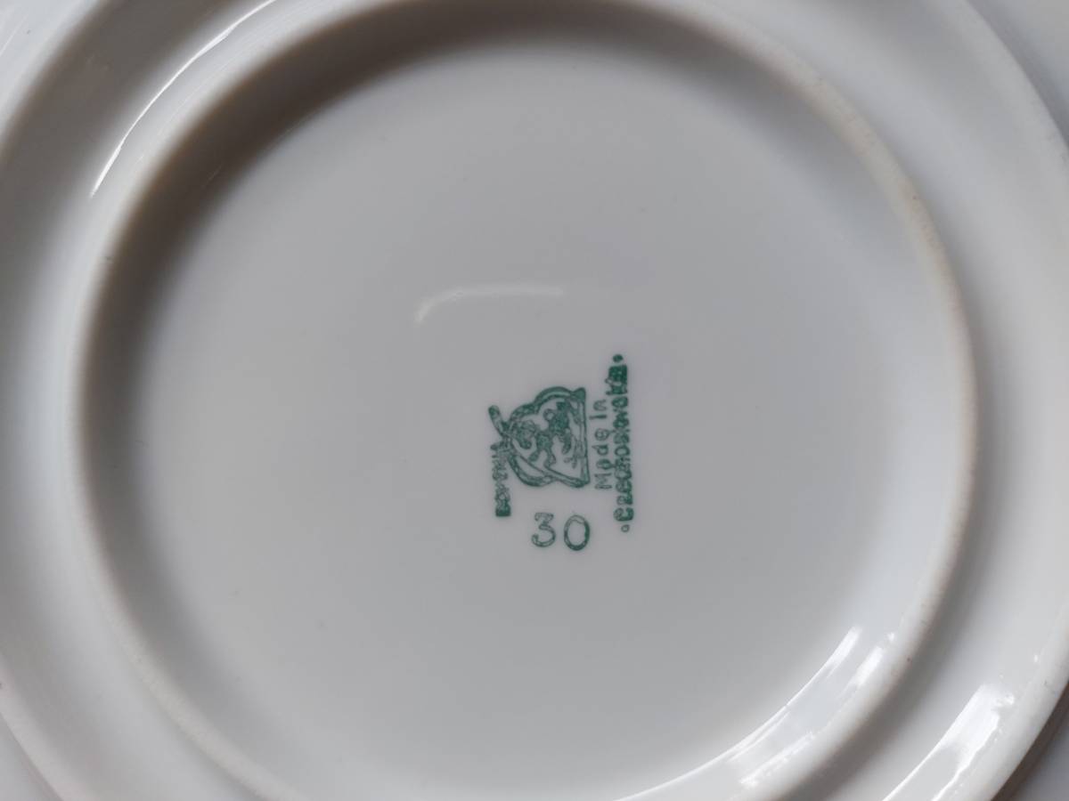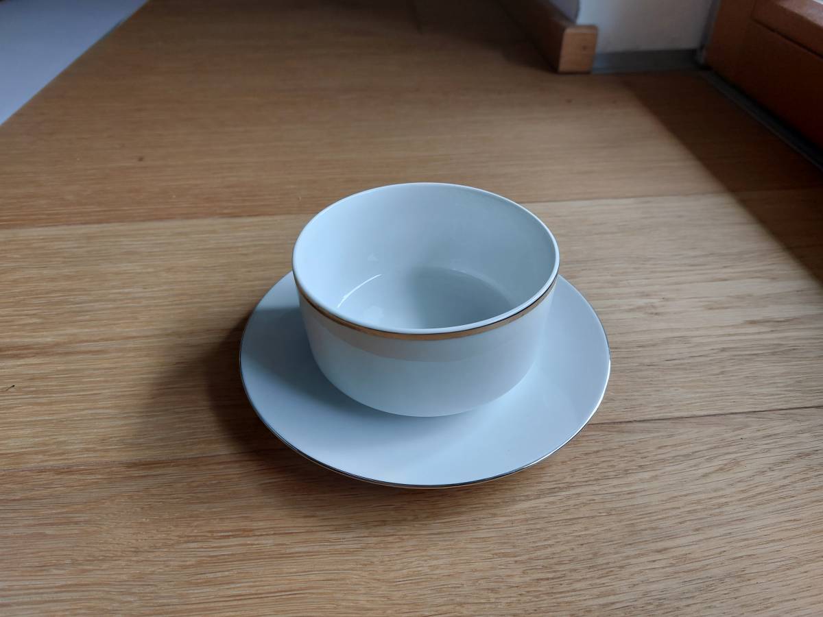 Daruji za odvoz misku z českého porcelánu, je pevně spojena s talířkem. Stříbrný okraj.