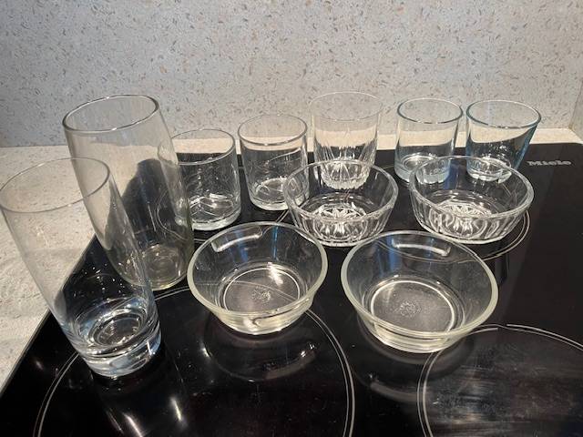 různé sklenice a misky skleněné