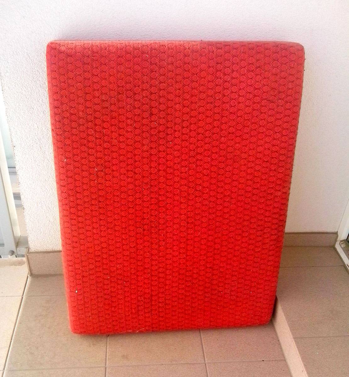 Třetinová matrace (rozměry: 65 x 85 x 13 cm) z mnoho dekád starého gauče. Sloužila jako pelech pro psa i kočky, takže asi už jen pro tento účel.