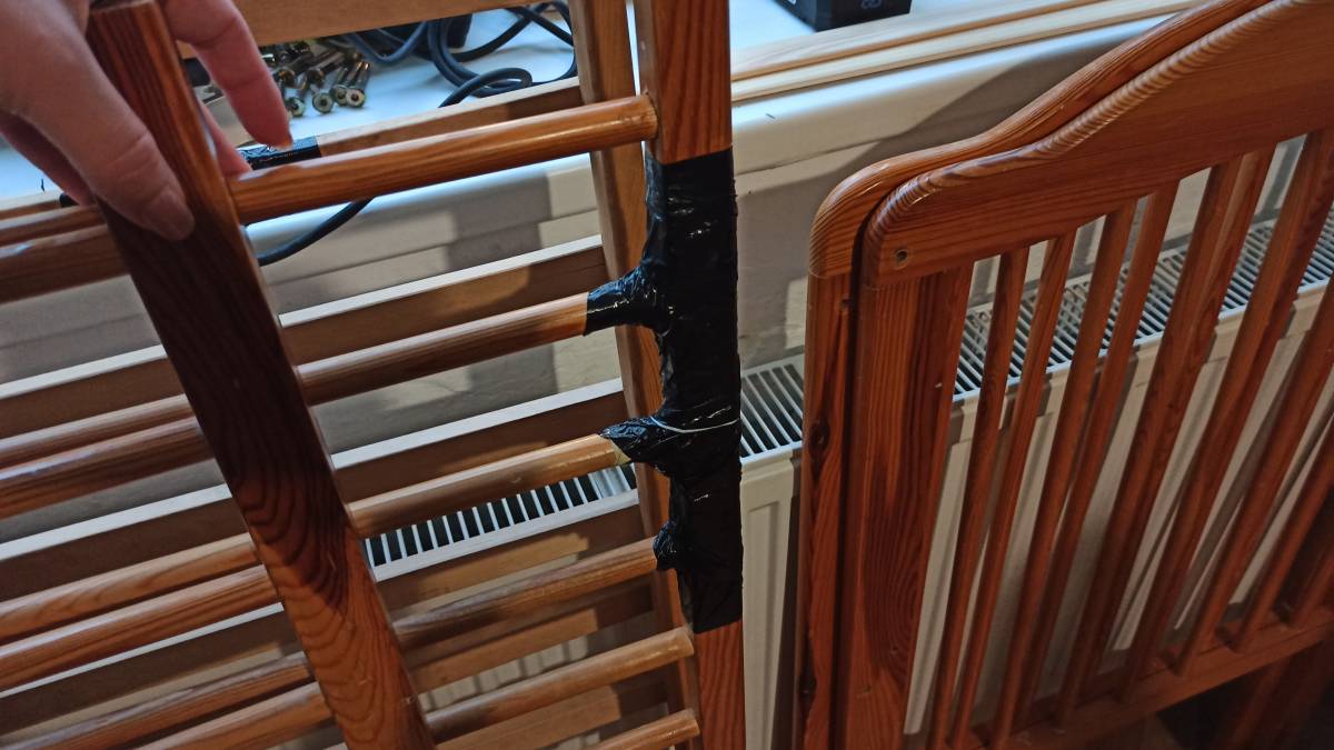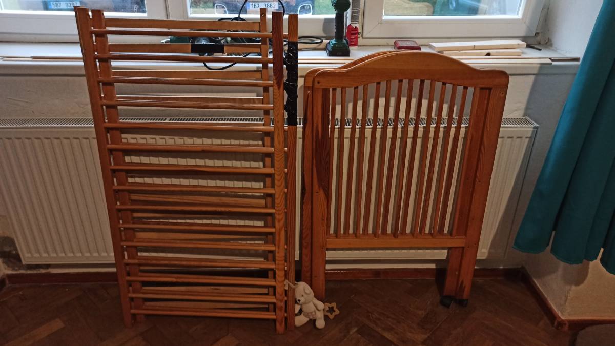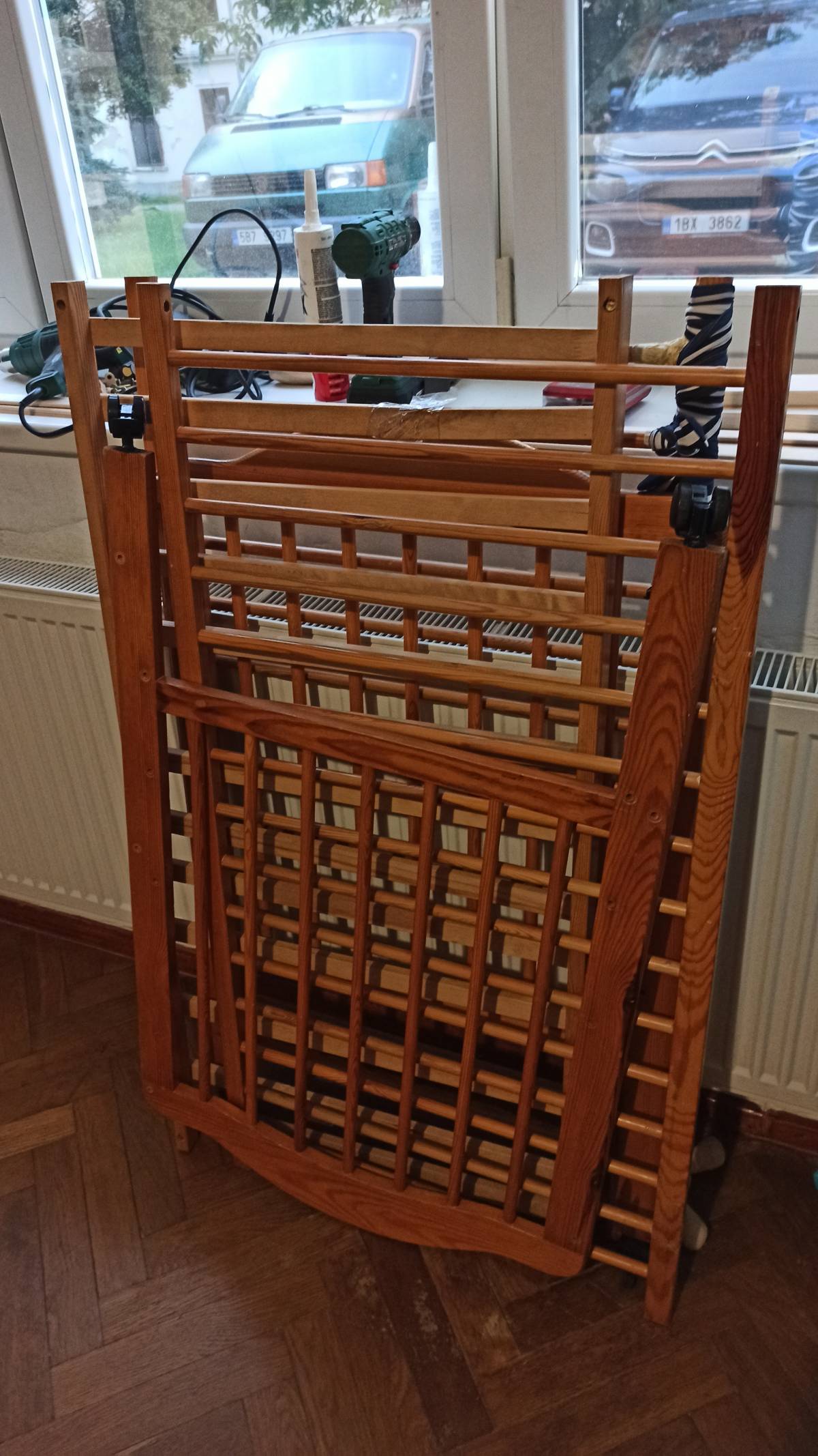 Daruji dětskou postýlku. Celkově je po 5 dětech a nese známky poškození - 1 zlomená lamela v roštu, někde trochu okousané zábradlí, tyčky se zábradlí se některé vysouvaly, tak jsou zalepené páskou, aby držely na místě (viz foto), 1 kolečko je lepené. Ale myslím, že jako náhradní postýlka někde na chatě nebo u babičky ještě poslouží, my už ji nevyužijeme.