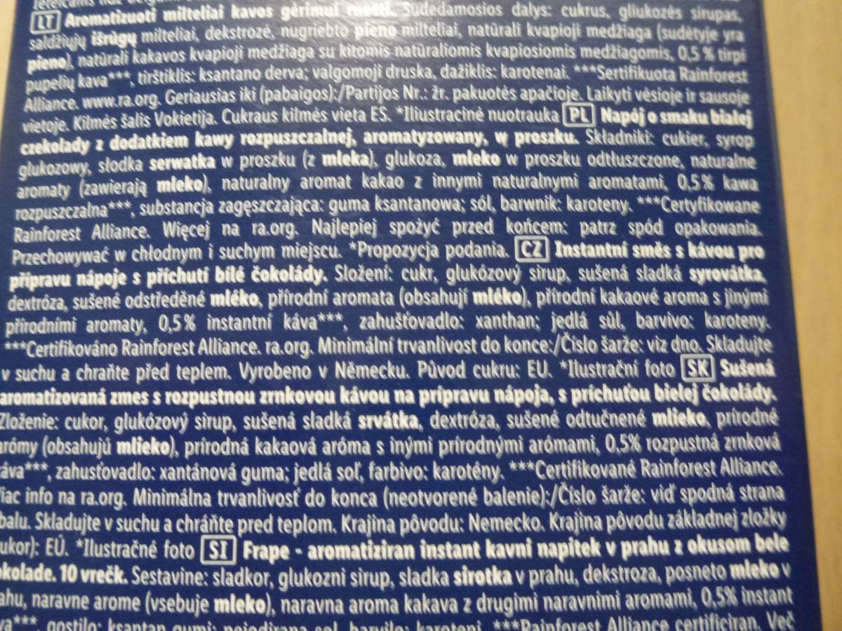 Daruji za odvoz neotevřenou instantní směs s kávou pro přípravu nápoje s příchutí bílé čokolády. Přidává se mléko. Trvanlivost do 03/2026.