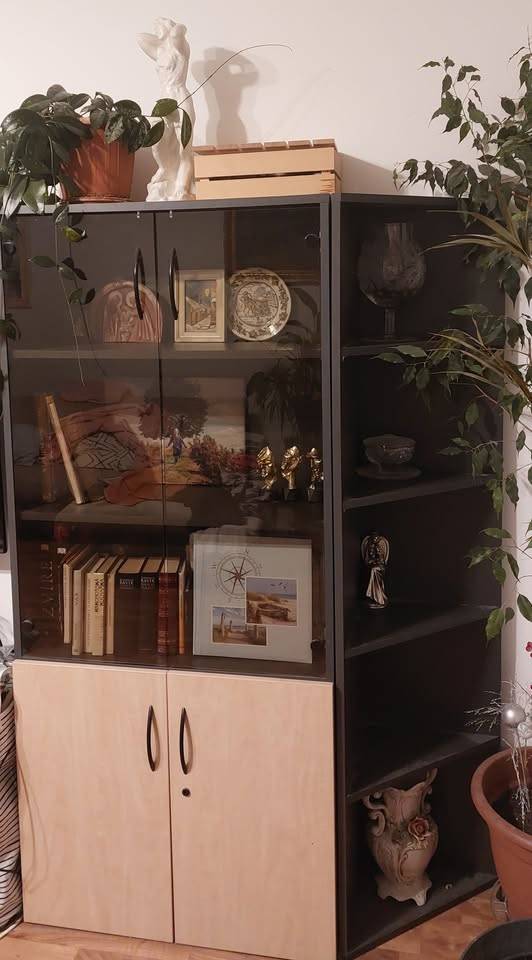 Prosklená skříň s policemi a šuplíkem