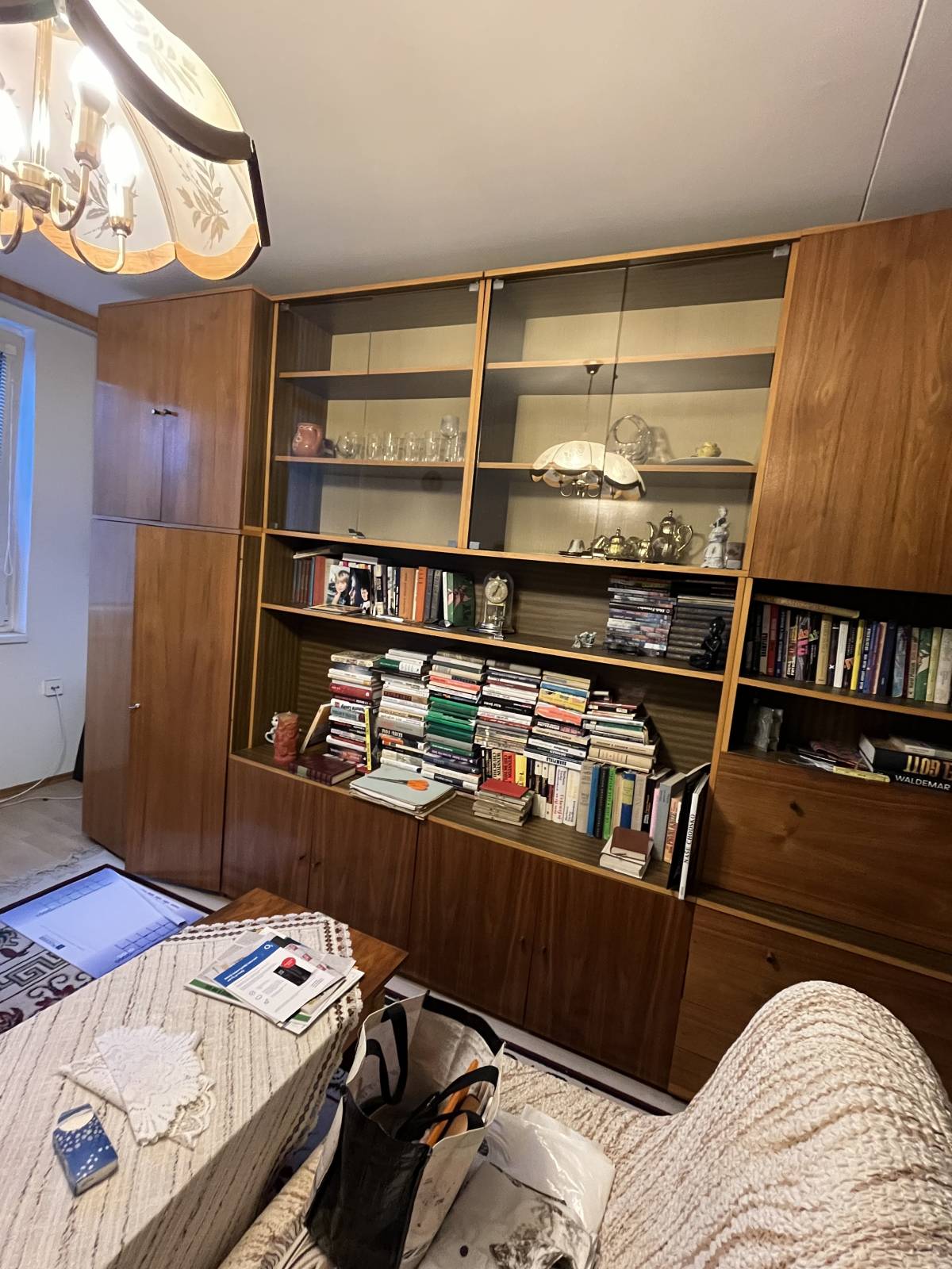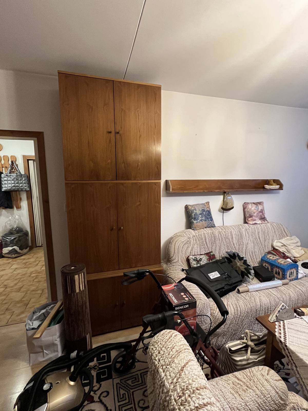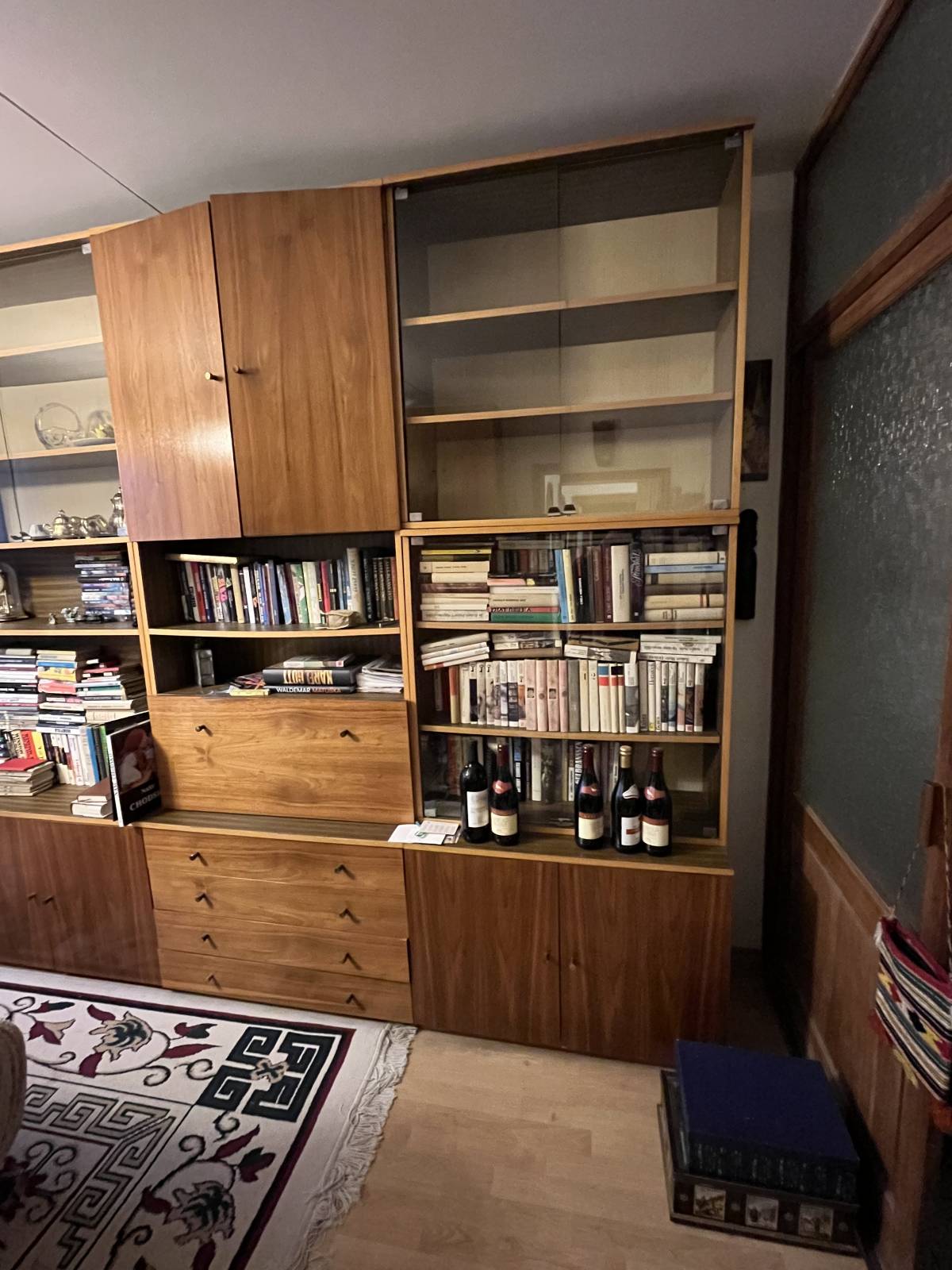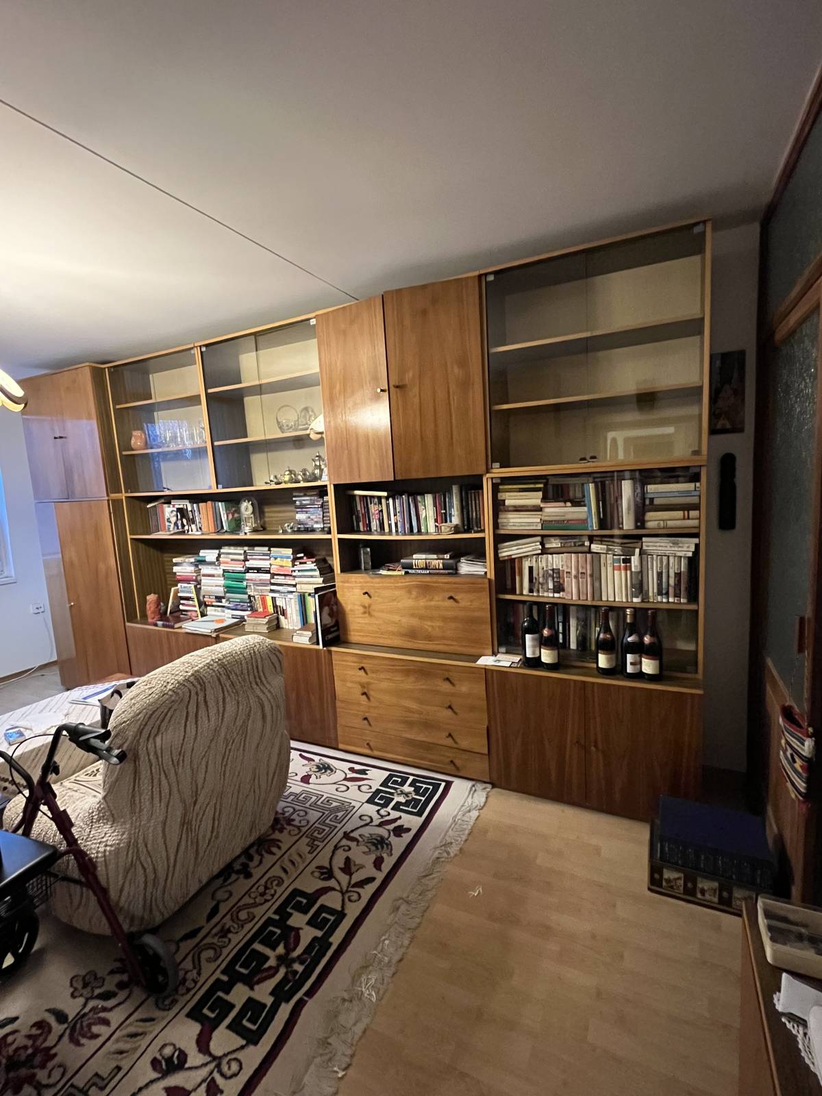 Daruji za odvoz starší obývací stěnu z pozůstalosti. Celkový stav dobrý, některé police lehce prohlé ale jinak všechny mechanismy fungují. Jedna ze skříněk je barová. Vysoká skříň je šatní.