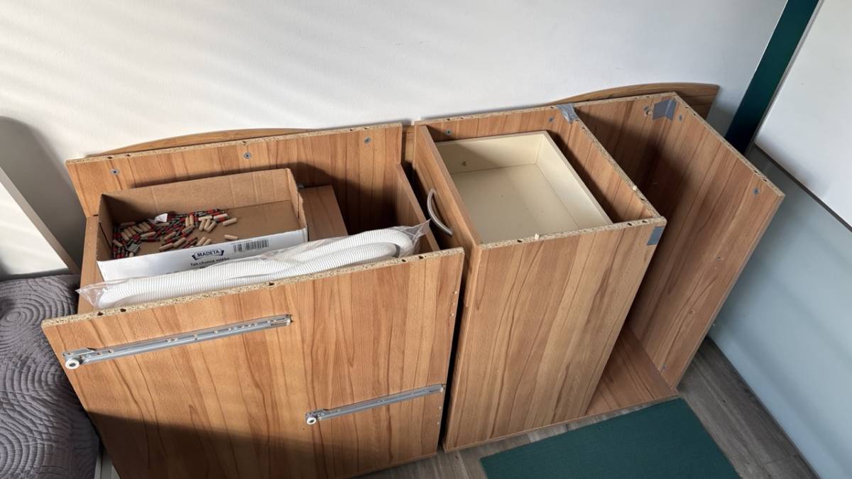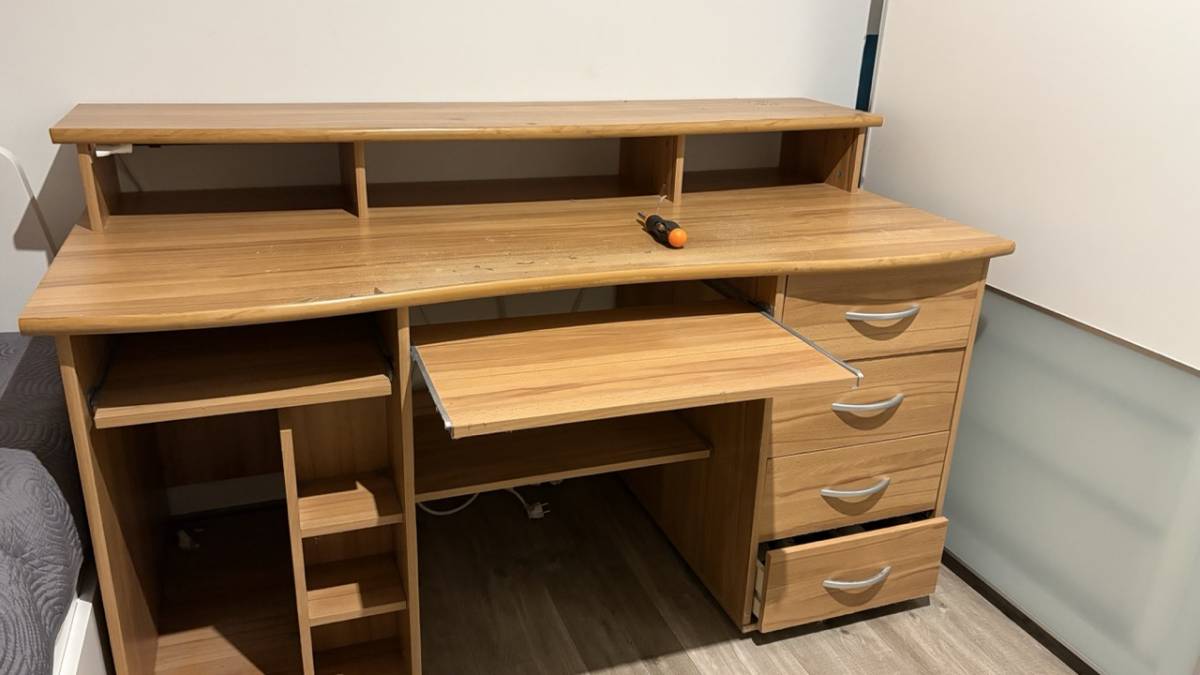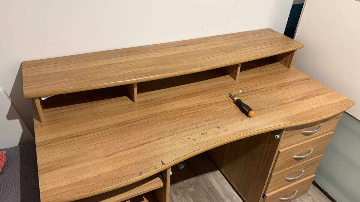 Daruji za odvoz stůl, stále funkční, částečně rozebraný, lze jednoduše sestavit případně sestavím před odvozem. Jedna zásuvka má porouchaný závěs.