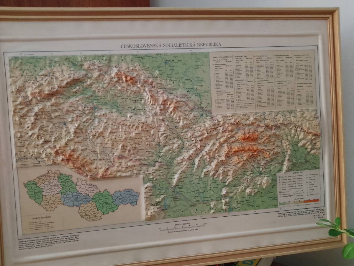 Daruji za odvoz plastickou mapu Československa v rámu š. 44,5 x d. 62 cm, měřítko 1 : 1 500 000, z roku 1962.