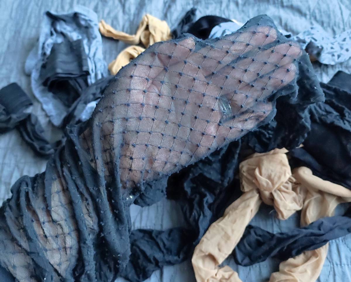 Daruji za odvoz, pár krát nošené punčochy různé vzory 6 ks a 2 samodržící podvazky.