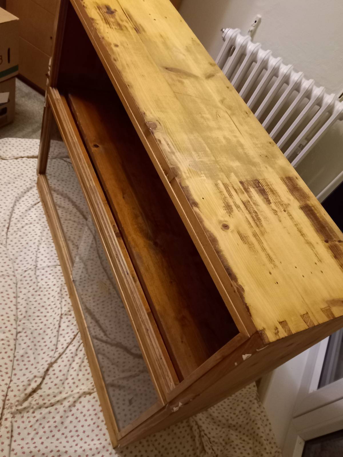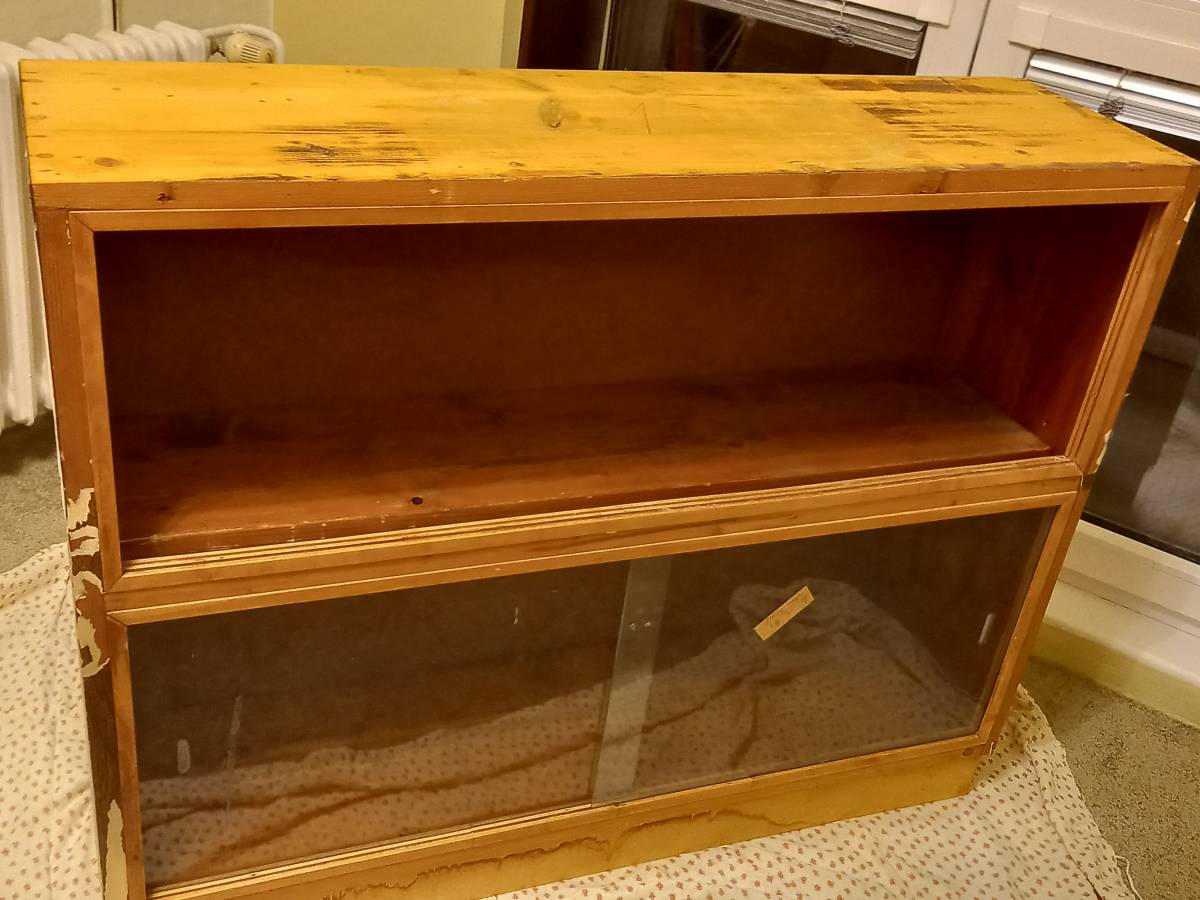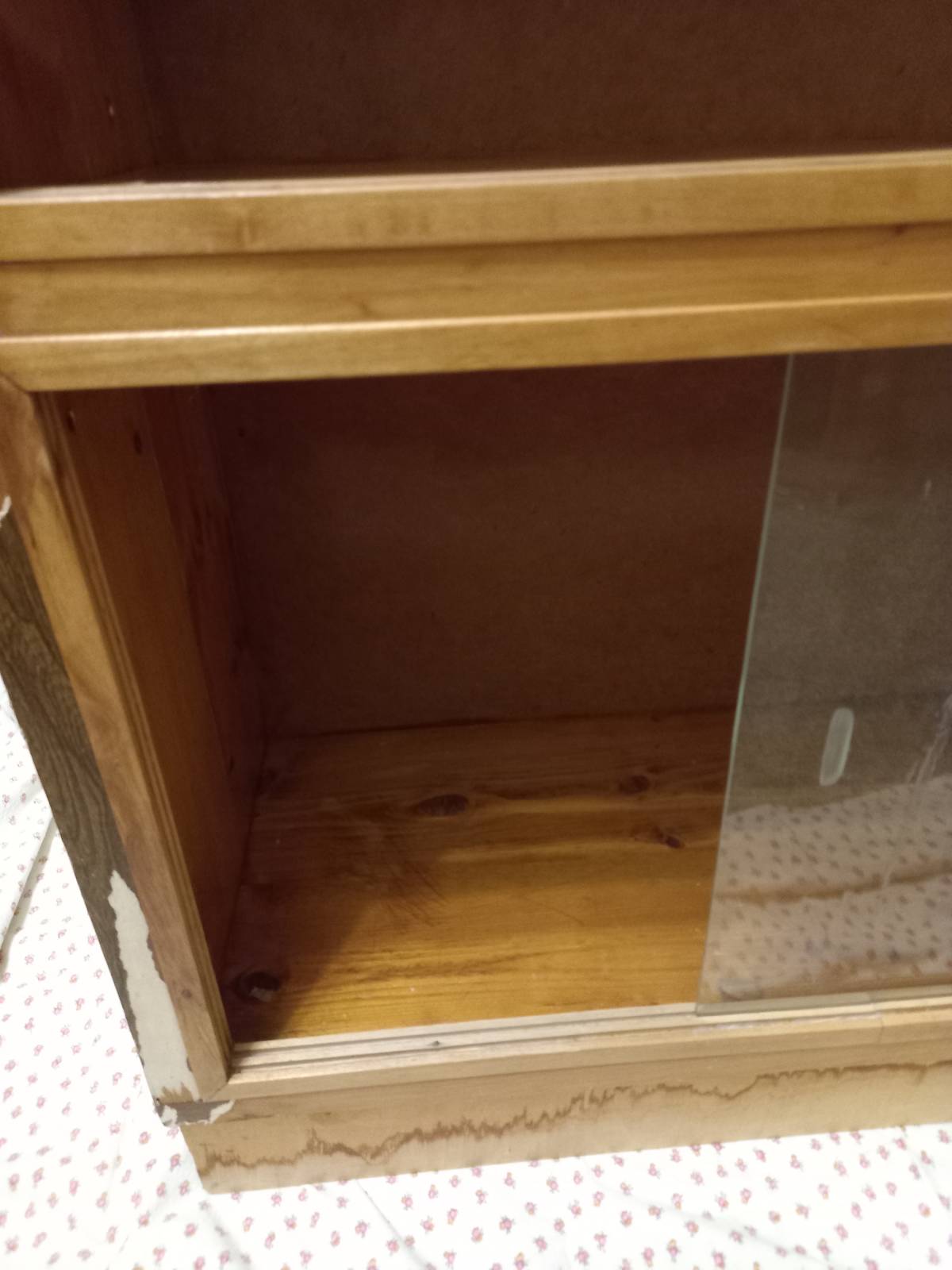 Daruji za odvoz prosklenou knihovničku z pravého zdravého dřeva. Na levé straně je třeba odstranit zbytek tapety.