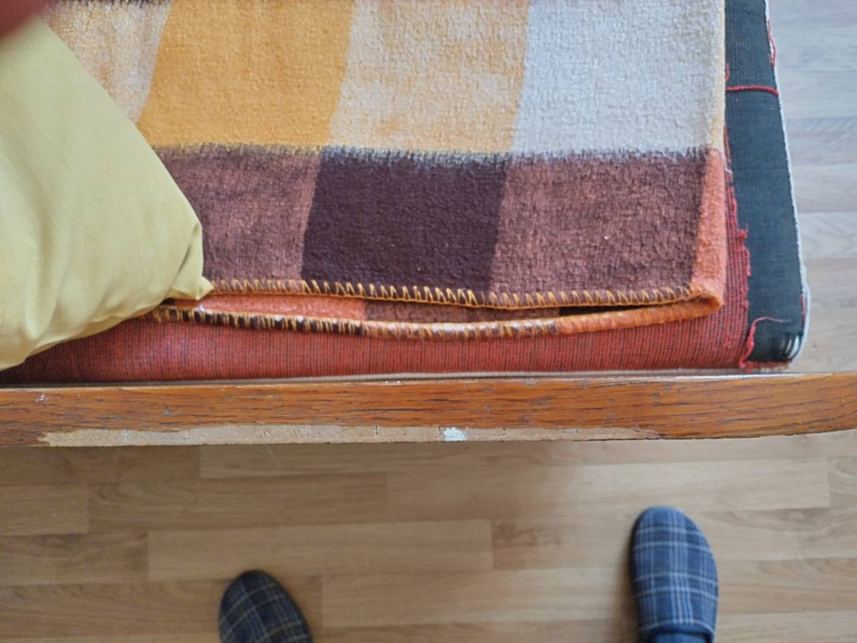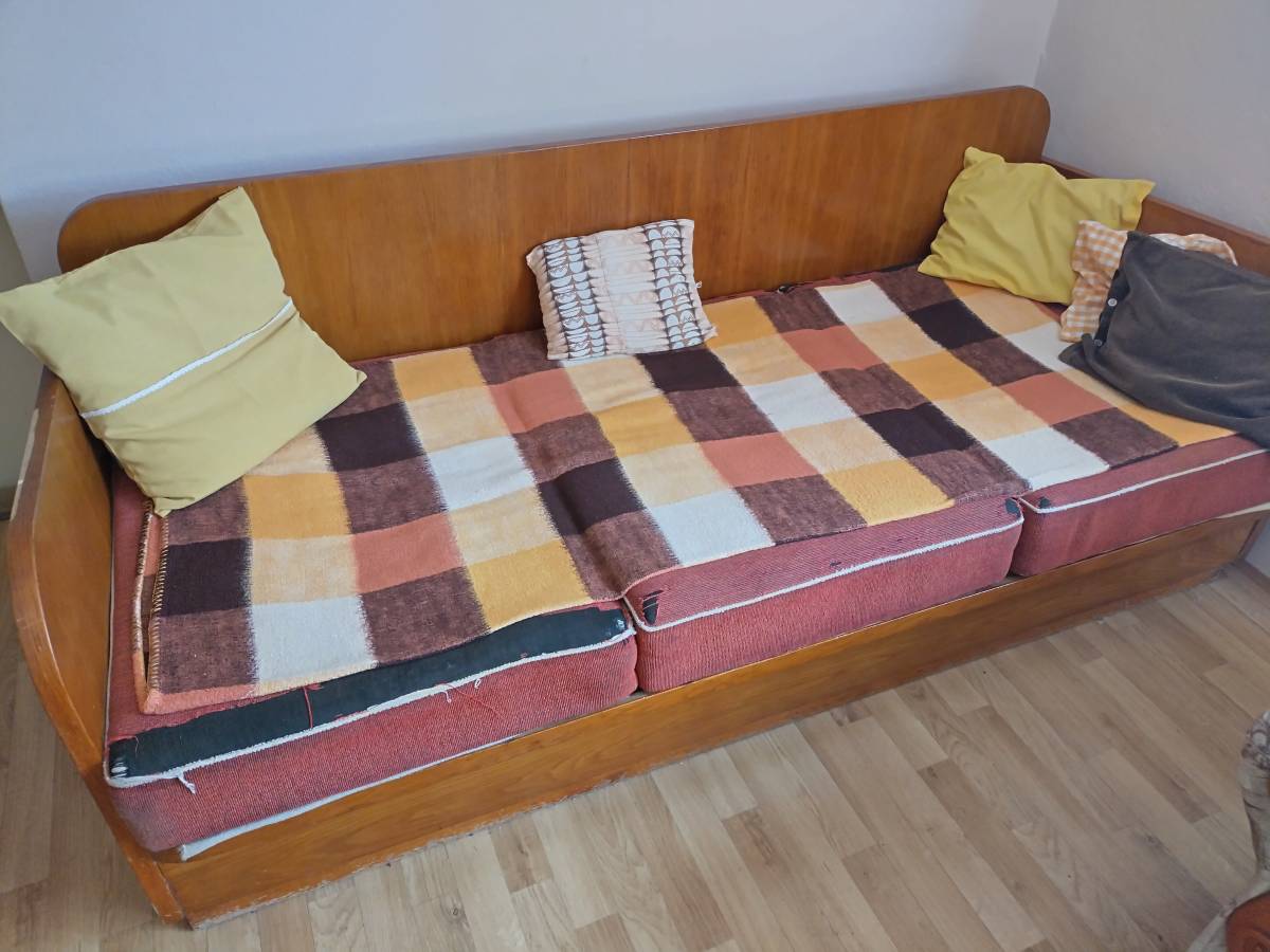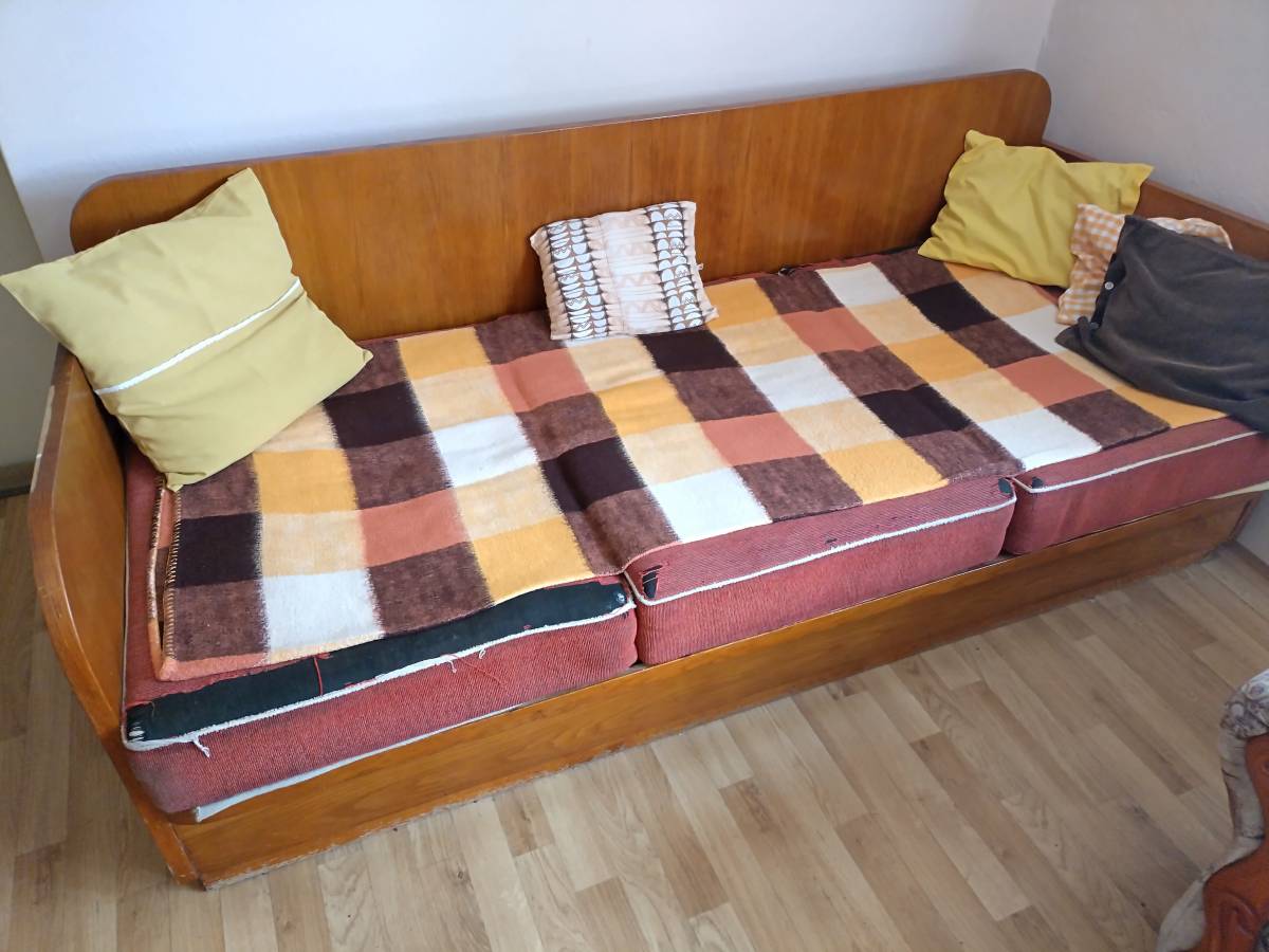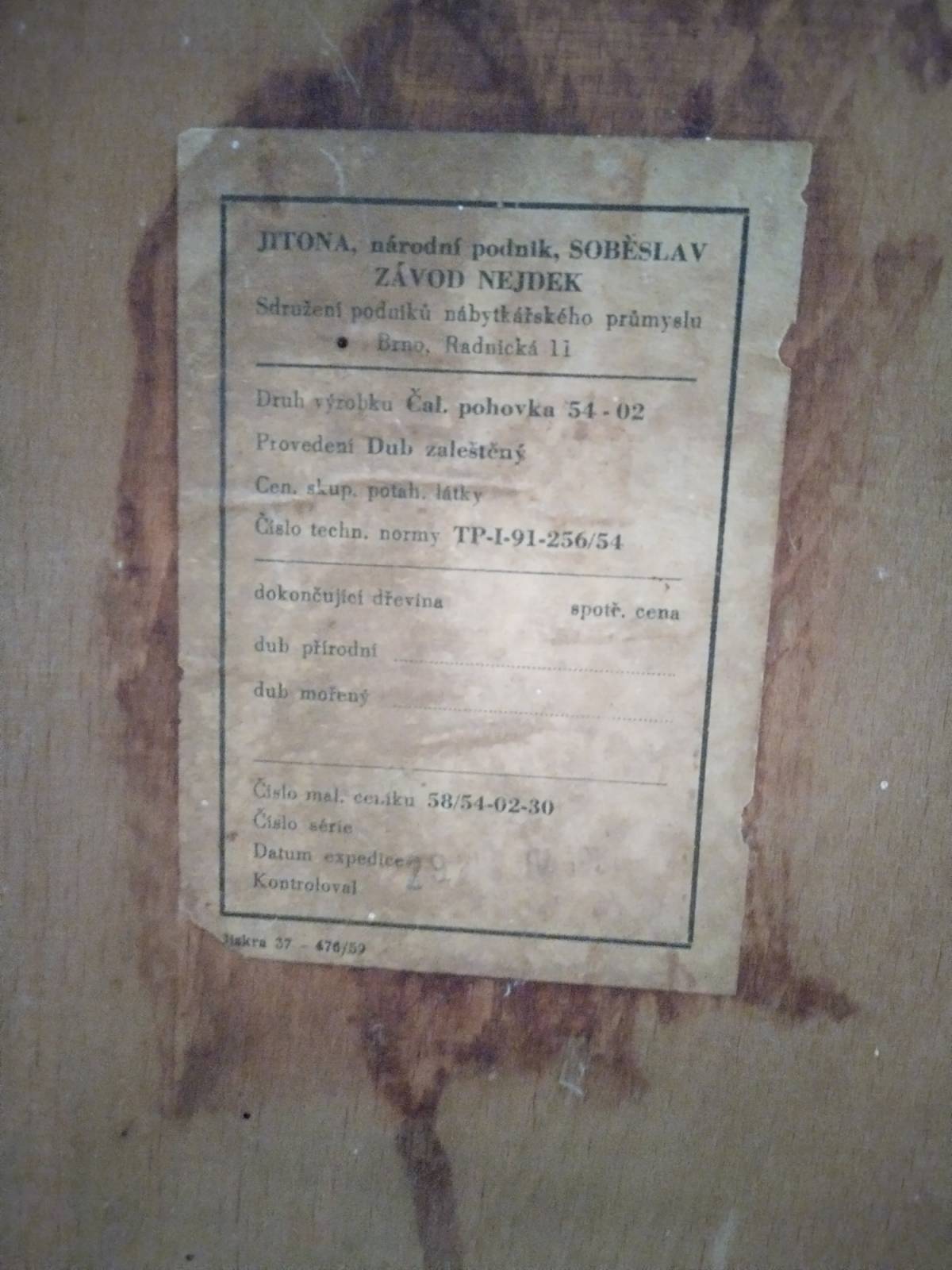 Gauč Jitona pravděpodobně z 60. let. Na štítku je uveden jako čalouněná pohovka 54 - 02. Datum expedice už je nečitelné. Gauč je rozkládací včetně všech původních matrací (i těch pro rozklad). Stav gauče i matrací odpovídá stáří. Gauč vrže, na jedné straně chybí kus dýhy (viz foto). Vhodné pro někoho kdo má dům stylovaný do tohoto časového období.