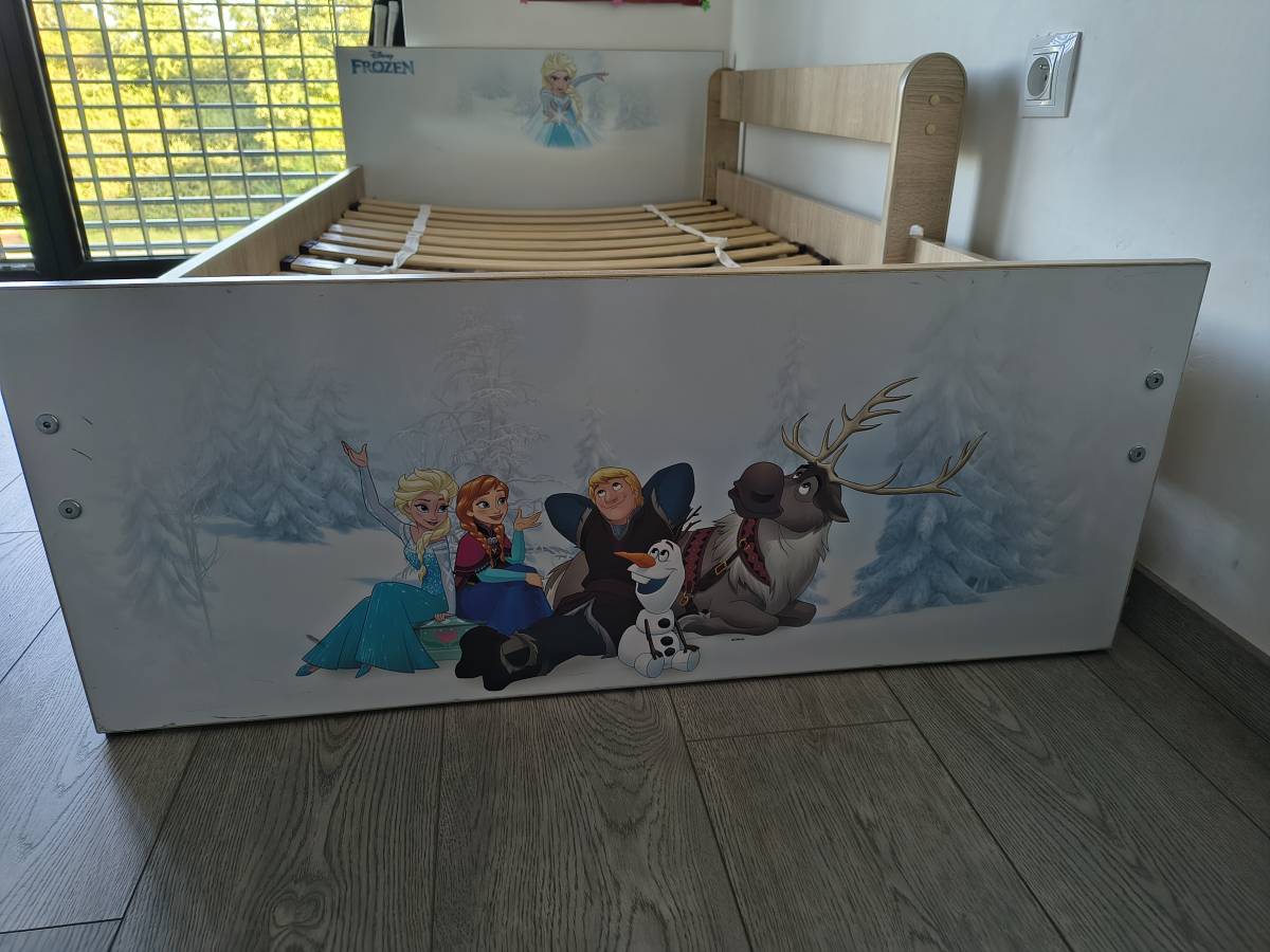 Dětská postel, použitá - kombinace skládacích desek pod matrací a rámu postele - stopy po hřebících (jinak se to pochybovalo...).