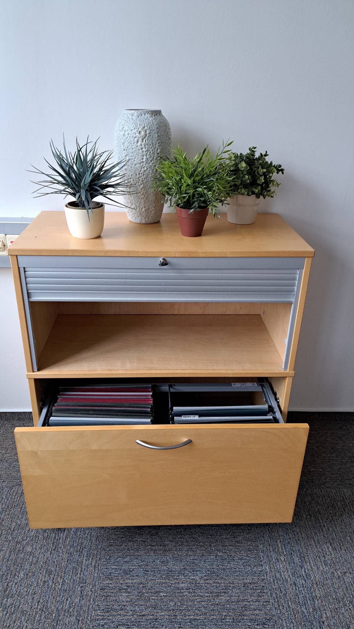 Kancelářský nábytek - skříňky, židle, umělé květiny, váza