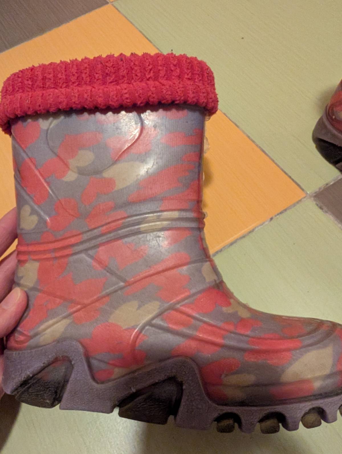 Daruji za odvoz dívčí zateplené holínky značky Demar, velikost 28 - 29. Barva růžovo-šedá. Odnímatelná molitanová vložka s růžovým pleteninovým lemem. Vložka se připevňuje podél horního okraje holínky suchým zipem.