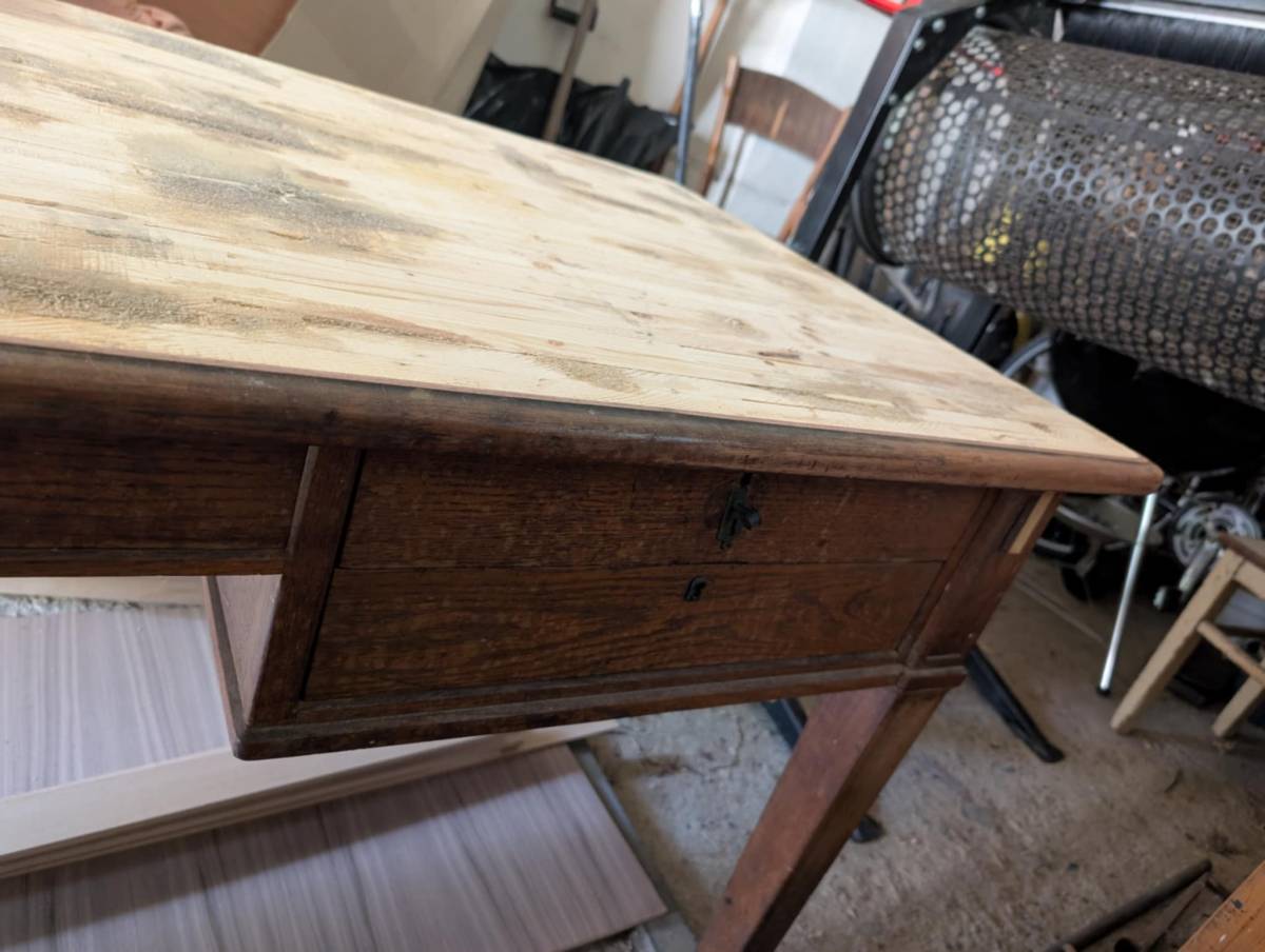 Vhodné pro kutily nebo někoho, kdo si ho chce dokončit podle sebe – po renovaci z toho bude krásný a poctivý pracovní nebo psací stůl.