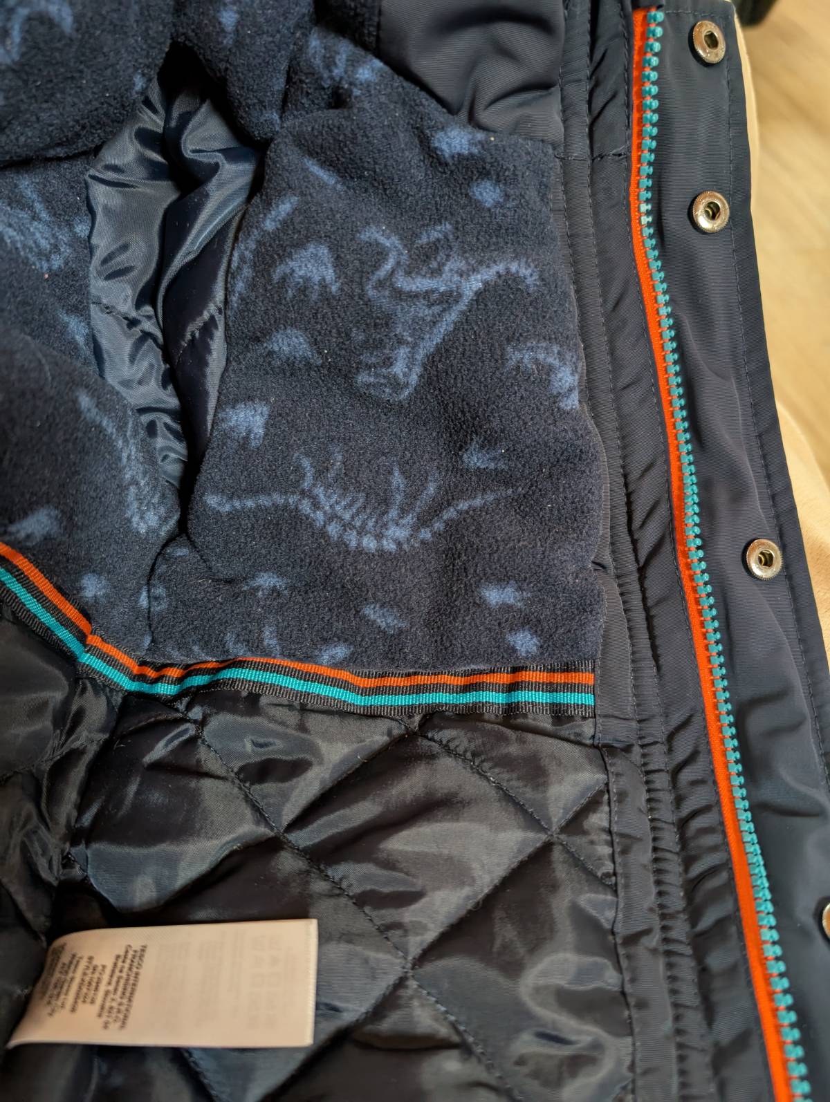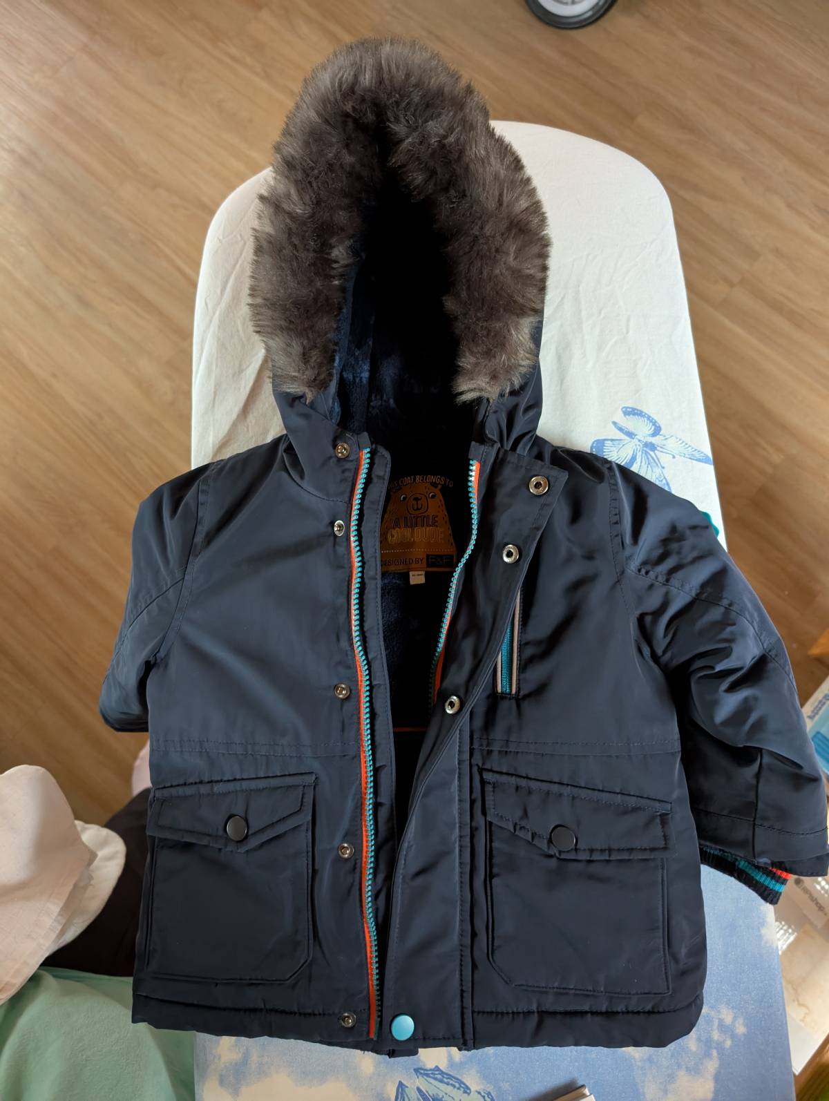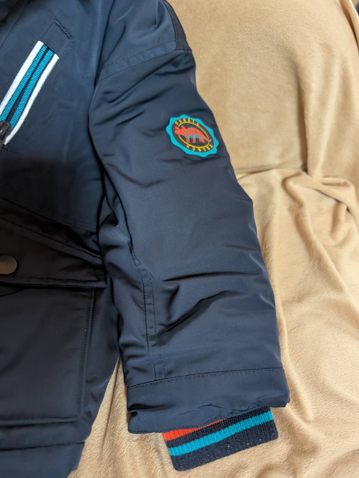 Daruji za odvoz (chlapeckou) velmi teplou zimní bundu. Neodnímatelná kapuce s umělou kožešinou. Zapínání na zip a patentky. Dvě větší kapsy se zapínáním na patentky a jedna malá náprsní na levé straně se zapínáním na zip. Rukávy jsou ukončeny úpletem, aby dobře přiléhaly k ručičkám.
