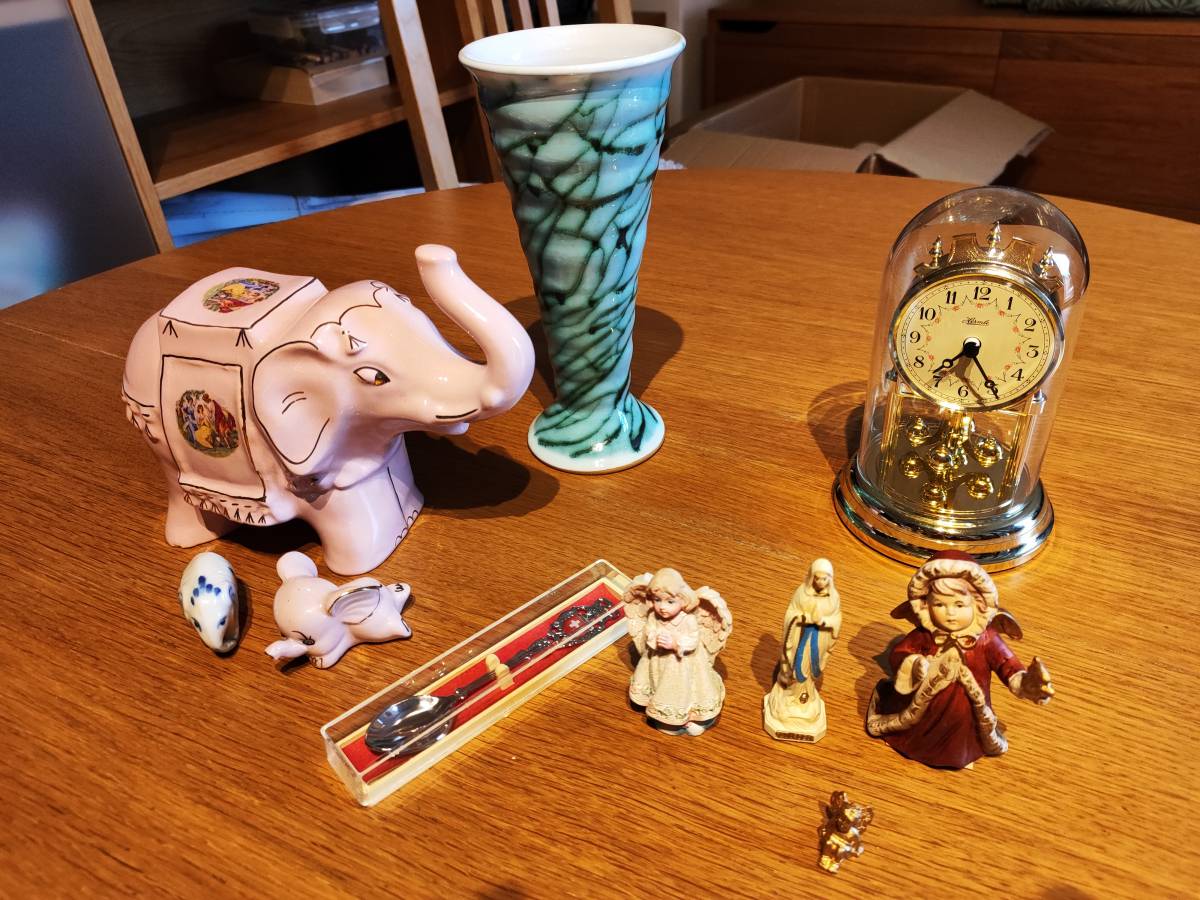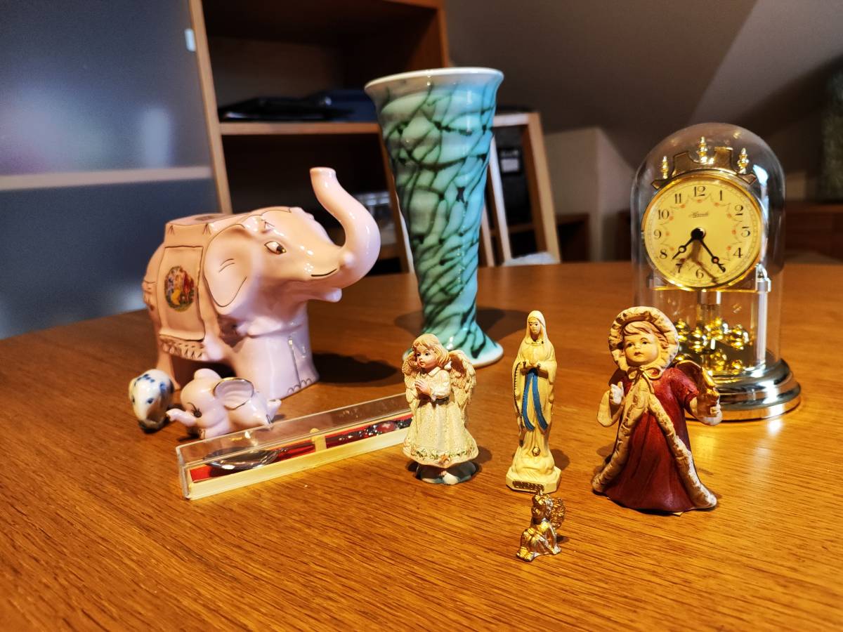 Porcelánový slon velký - neznačkový, "oboustranná" keramická váza, hodiny (aktuálně nejdou, nezkoumala jsem), dekorační lžička a malé figurky. Předání ideálně jako celek v Praze Braníku.