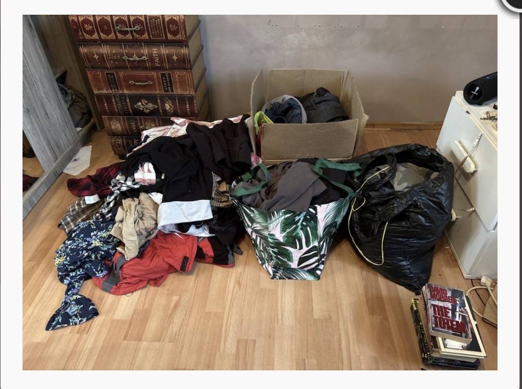 Trička, mikiny, kalhoty, bundy. Nemáme to kam dát a jen to tady překáží. Pokud někdo chce. Mame tu několik pytlů