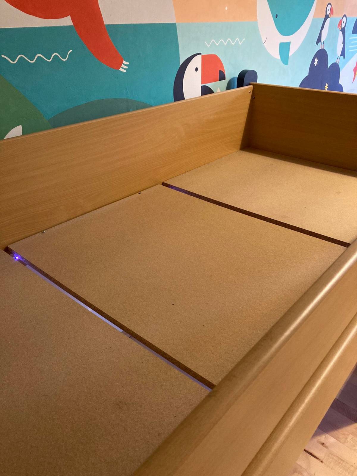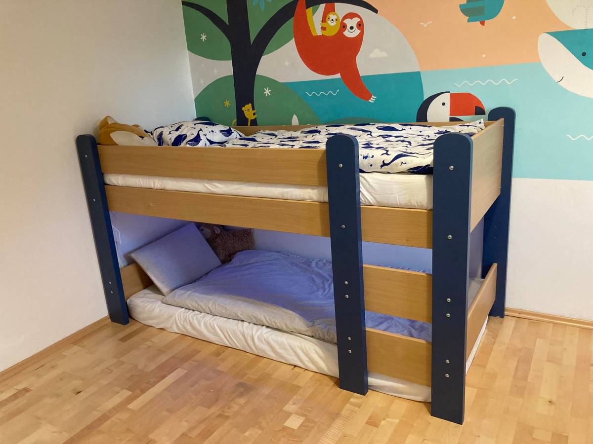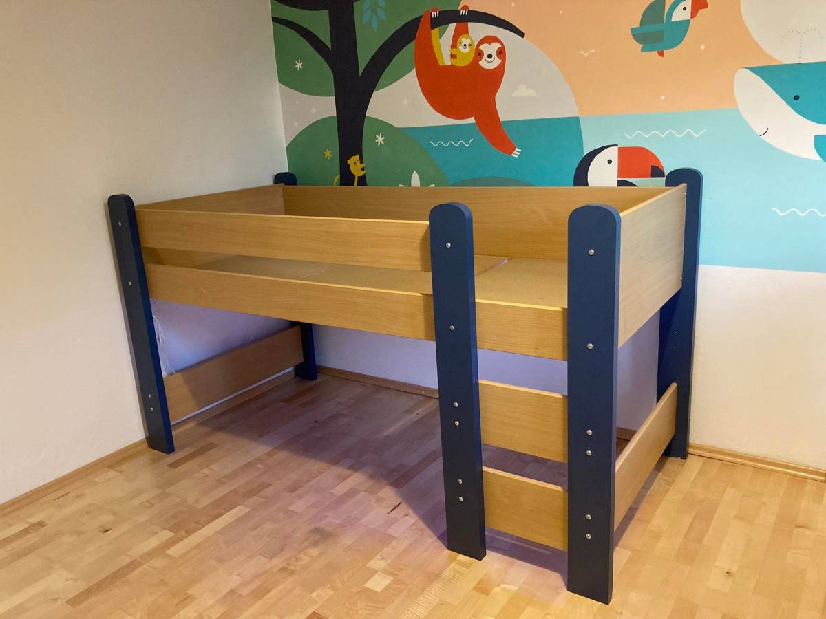 Postel je celá dřevěná, je z masivu a tmavě modré dřevotřísky. Horní lůžko je cca 100 cm nad zemí. Rozměry matrace jsou 90 x 200 cm (normální dospělácká matrace).