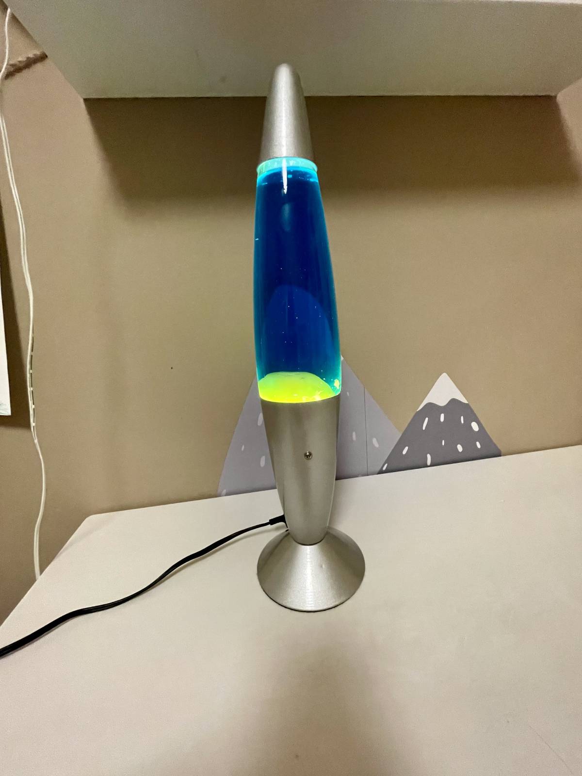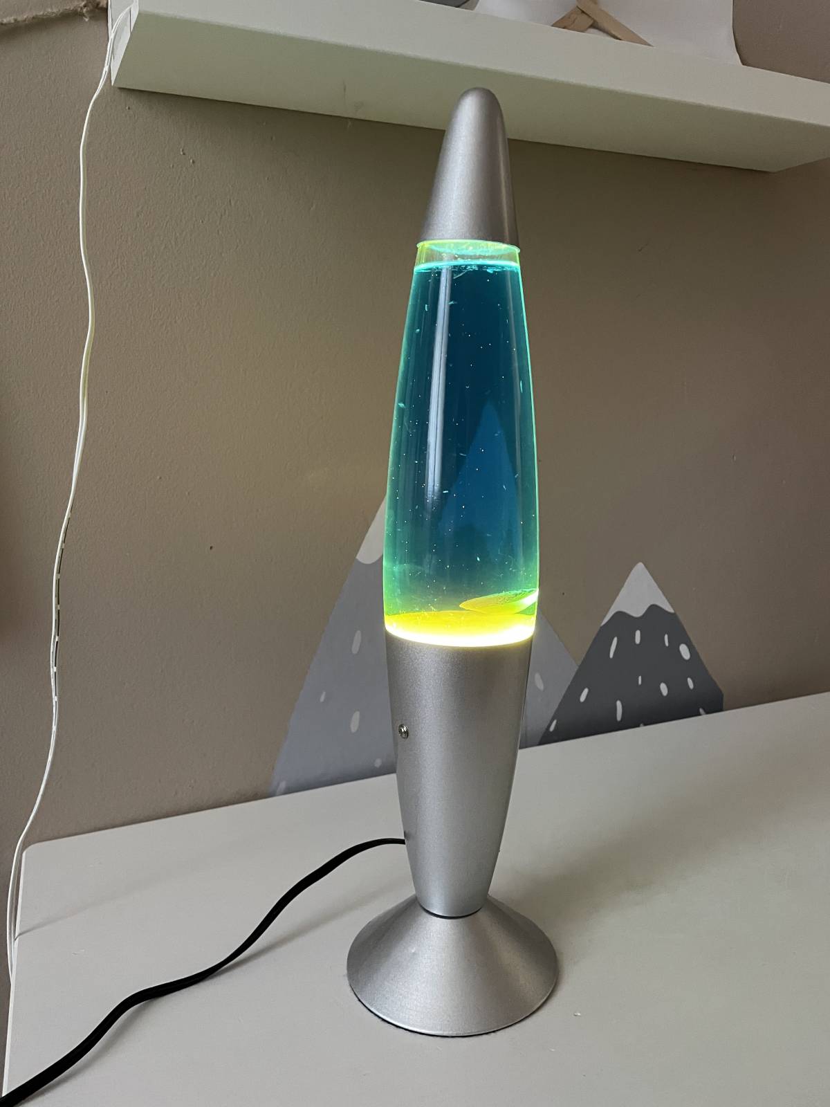 Funkční lávová lampa, tekutina je modrá, vosk je žlutý, svítí zeleně :).