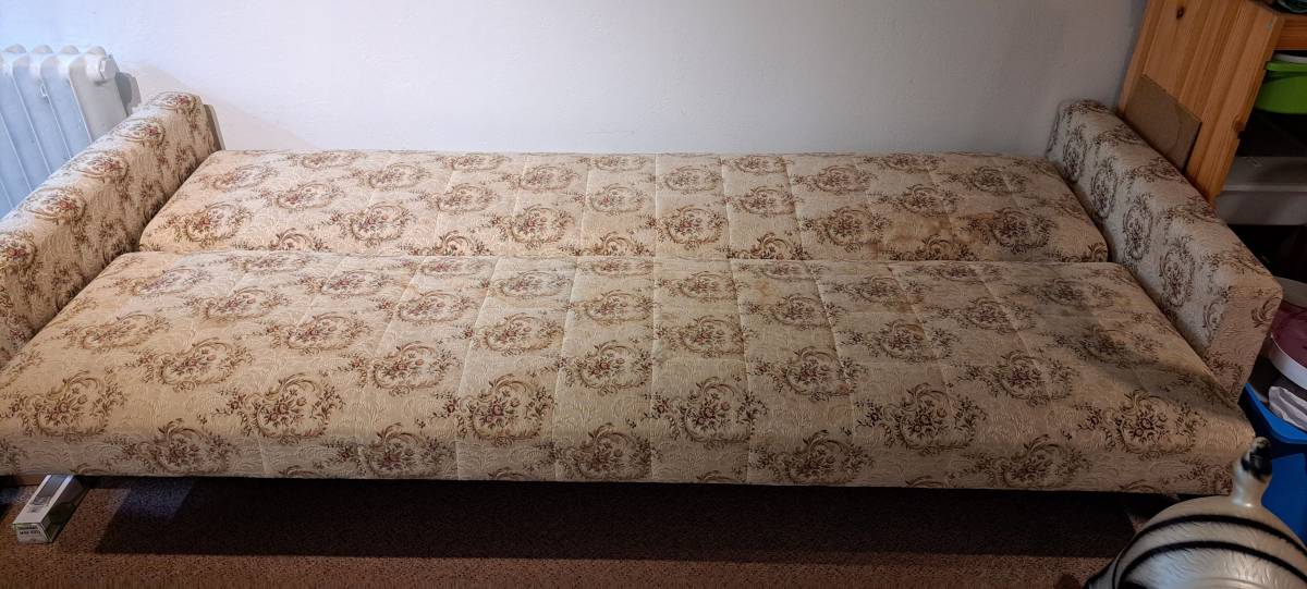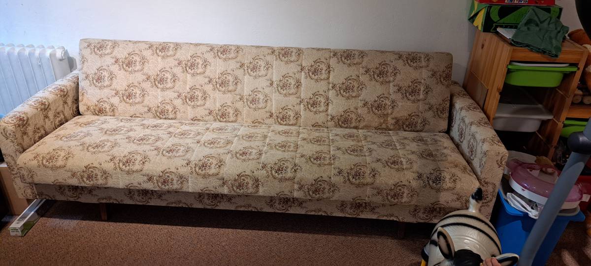 Pohovka viz fotky pro sezení/ležení. Stará, ale v zachovalém funkčním stavu. Nachází se v 1. poschodí a je nerozebiratelná, takže bude potřeba 2 schopné silné lidi na její vystěhování. Pouze osobní převzetí.