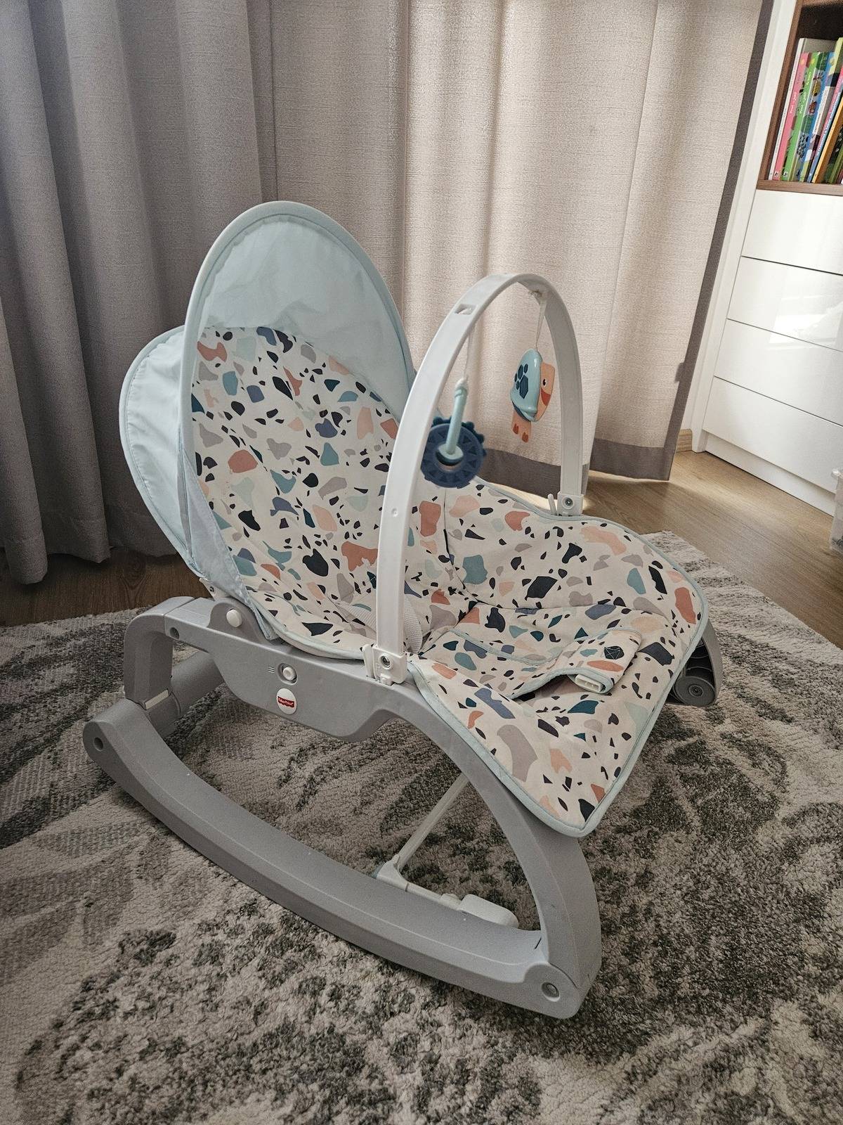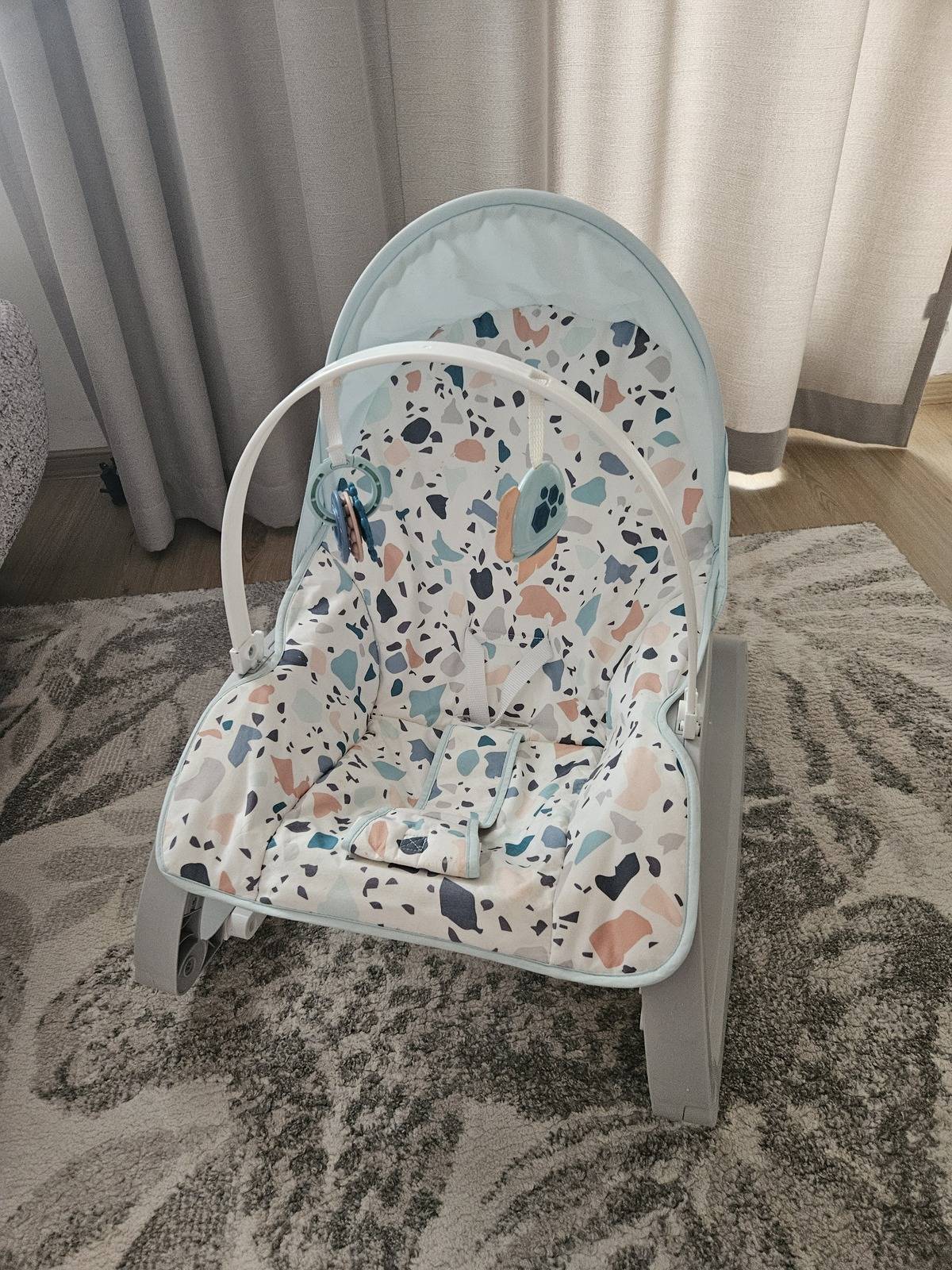 Daruji sedátko Terrazzo. Určeno pro děti od půl roku. Sedátko nabízí dětem vibrace a také pohled na zvířátka zavěšená na hrazdičce. Pokud děti povyrostou, lze hrazdičku odejmout a použít sedátko jako křesílko.