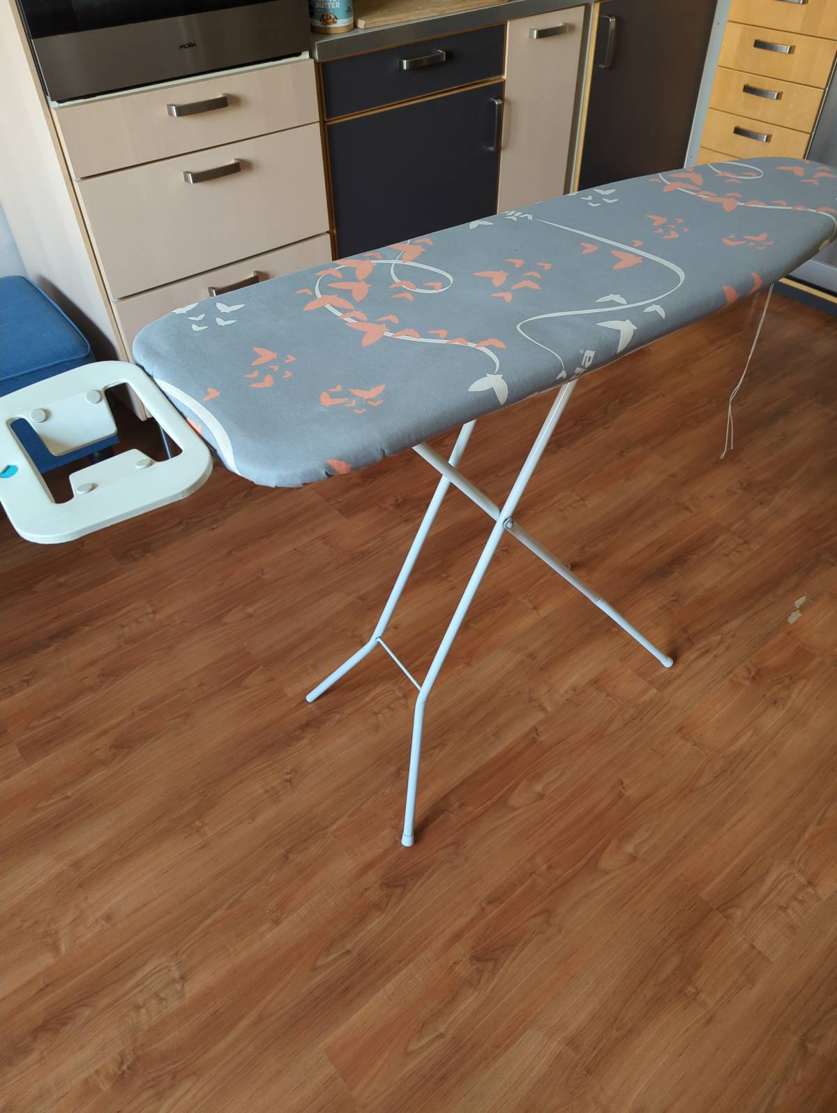 Daruji za odvoz žehlící prkno včetně potahu. Plně funkční. Část konstrukce je rezavá viz foto. Nemá to vliv na užívání. Chybí jeden ochranný špunt na podnoží prkna.
