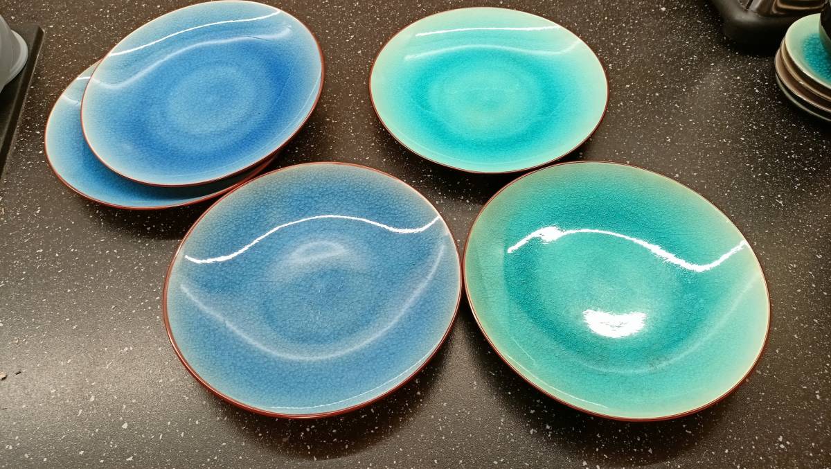 5 mělkých talířů (3 modré + 2 tyrkysové),