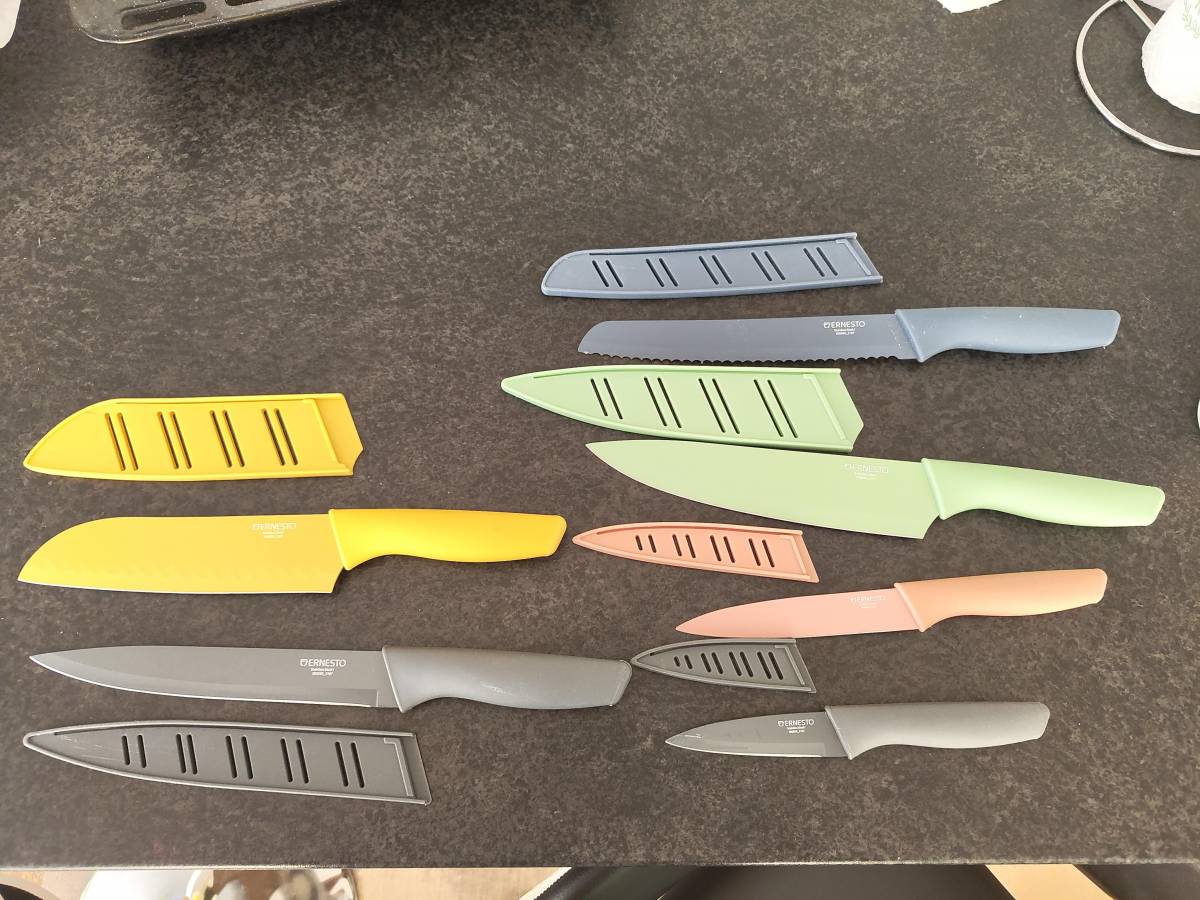 Vařečka, obracečka, stěrka, lis na česnek, škrabka, ovírák na víno, palička, struhadlo, sítko, mlýnek na koření, brousek na nože, pánev, příbory, kuchyňské nože, podložky, Konvice na čaj, Sklenice a hrníčky, Koš s víkem, Varná konvice.