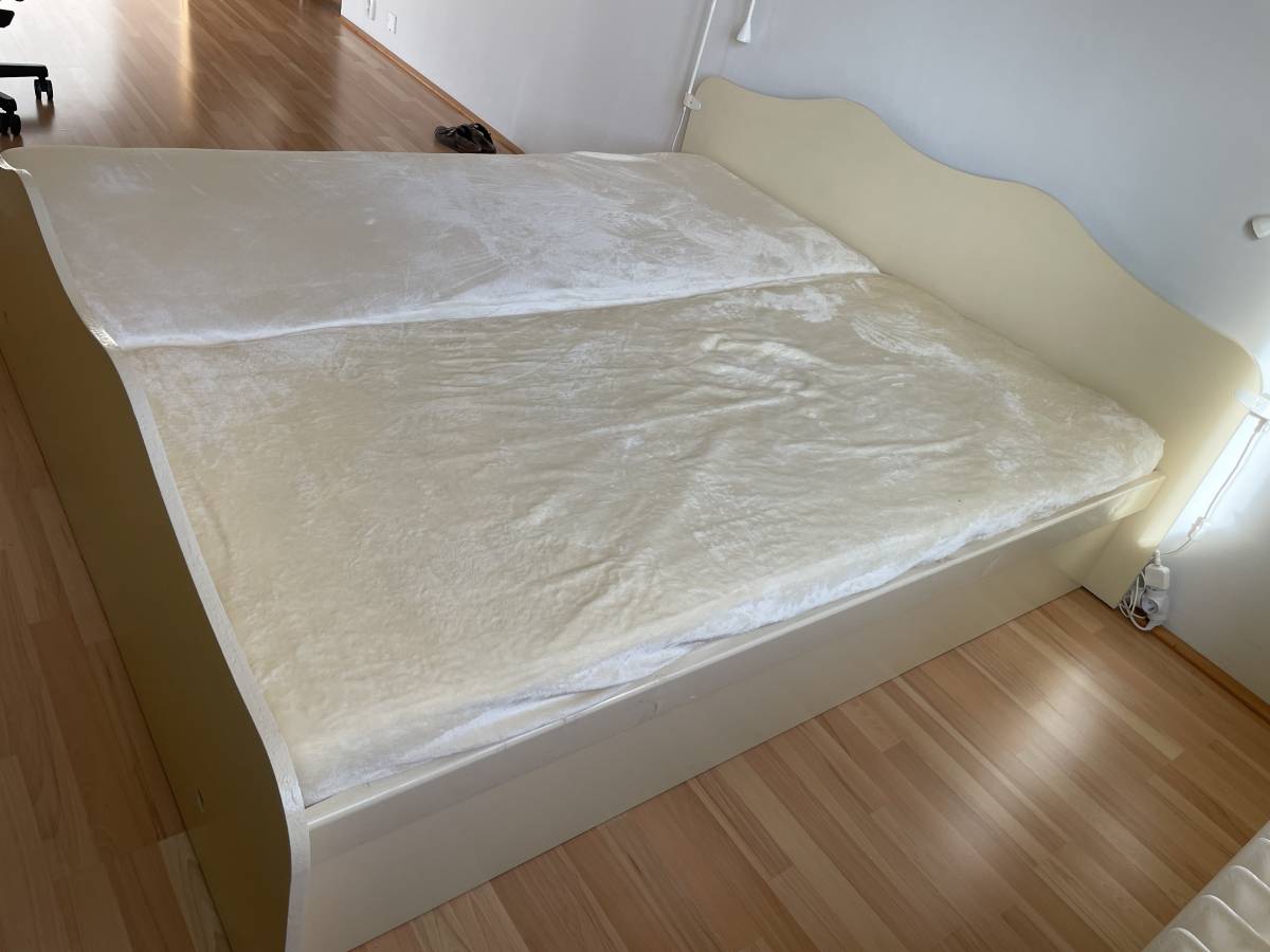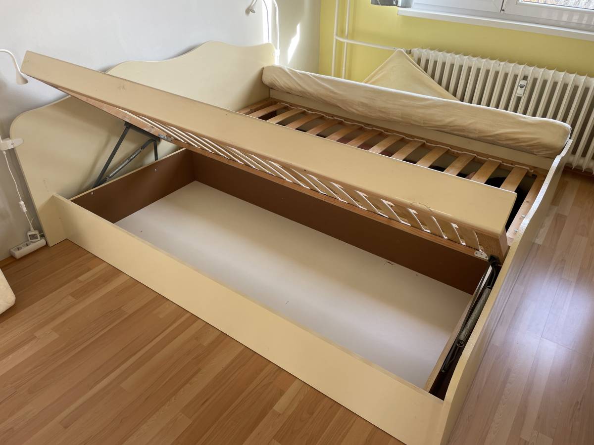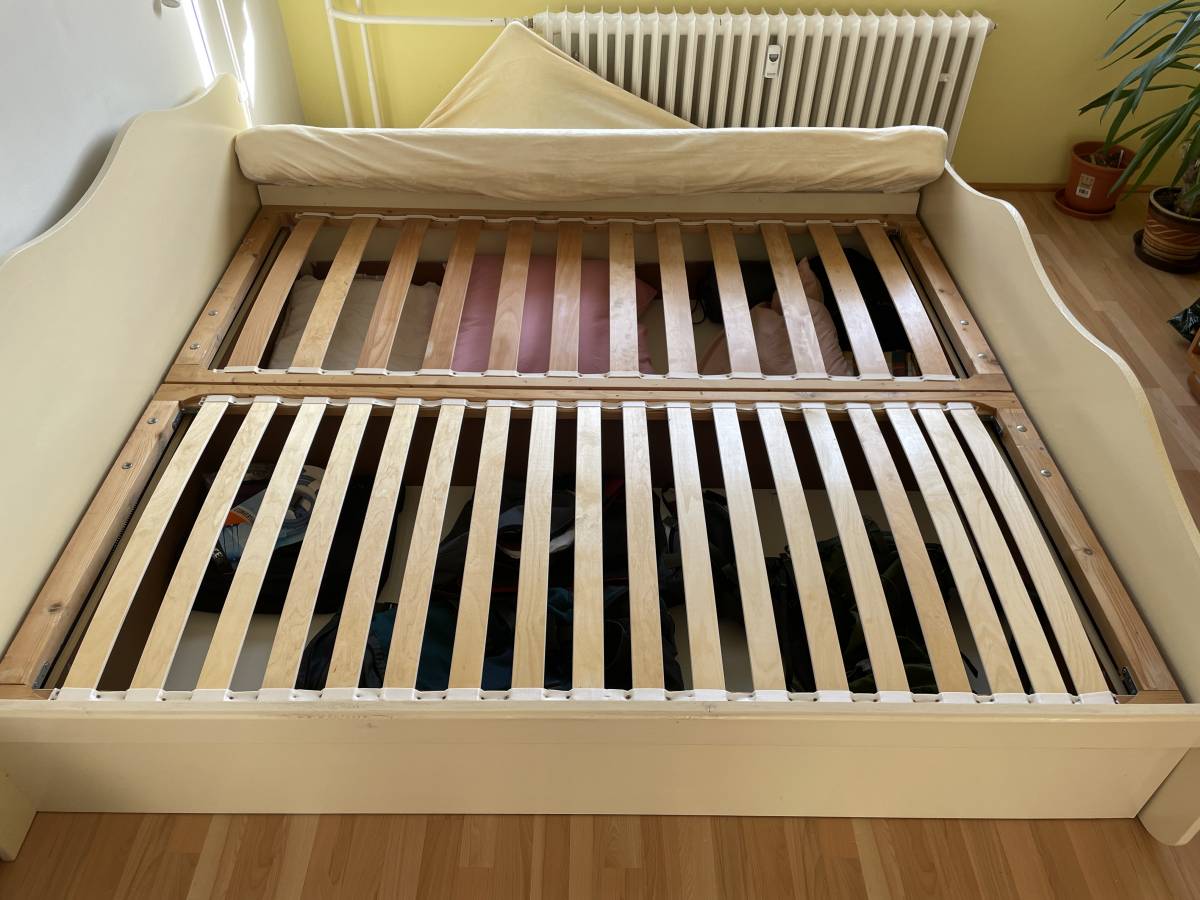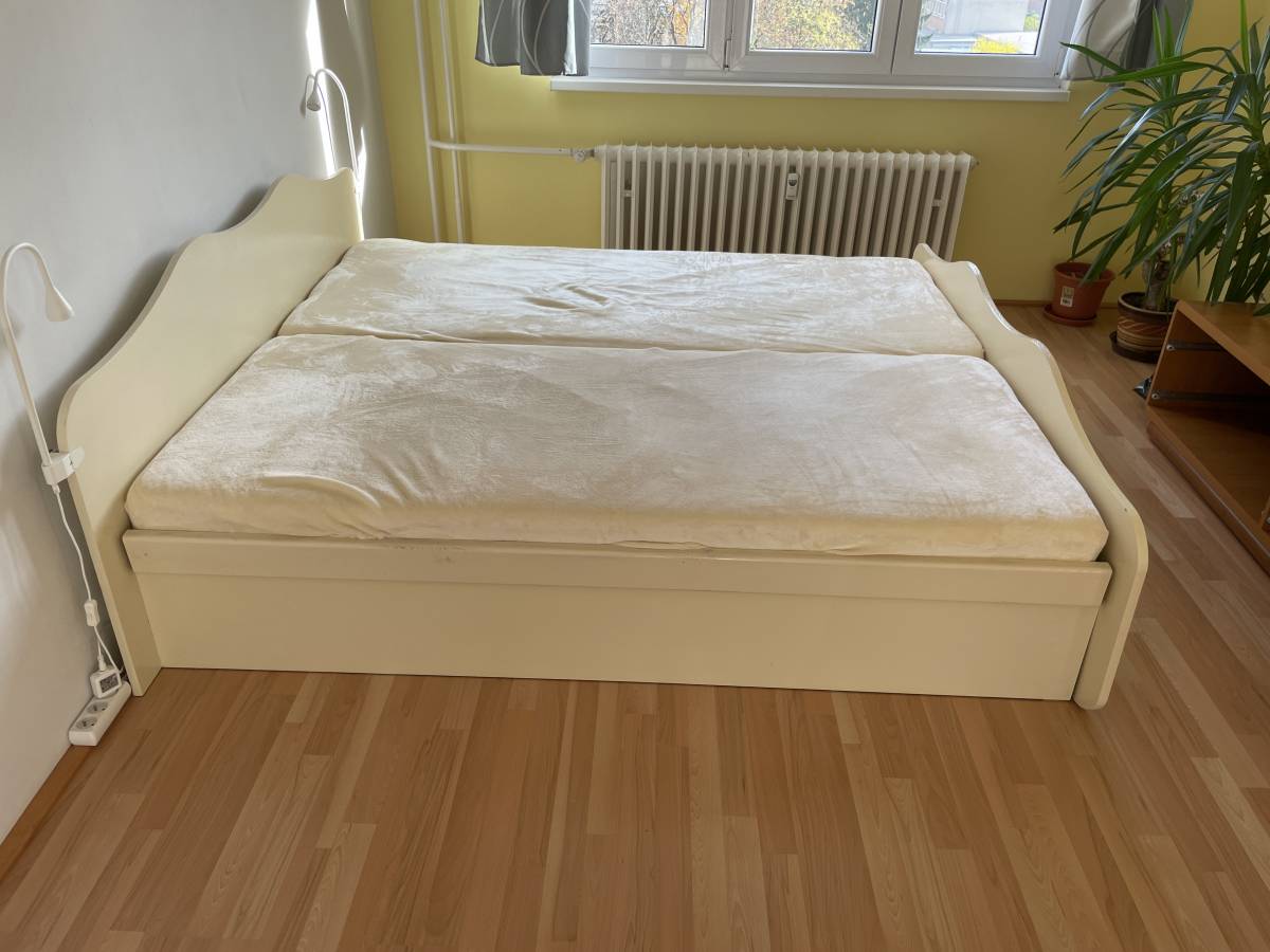 Daruji manželskou postel o šířce 170 a délce 195 cm a úložným prostorem. Původně byla postel s potahem, dnes s nátěrem v barvě bílá slonová kost. Jedna postel má nové rošty, druhá původní. Součástí jsou i matrace.