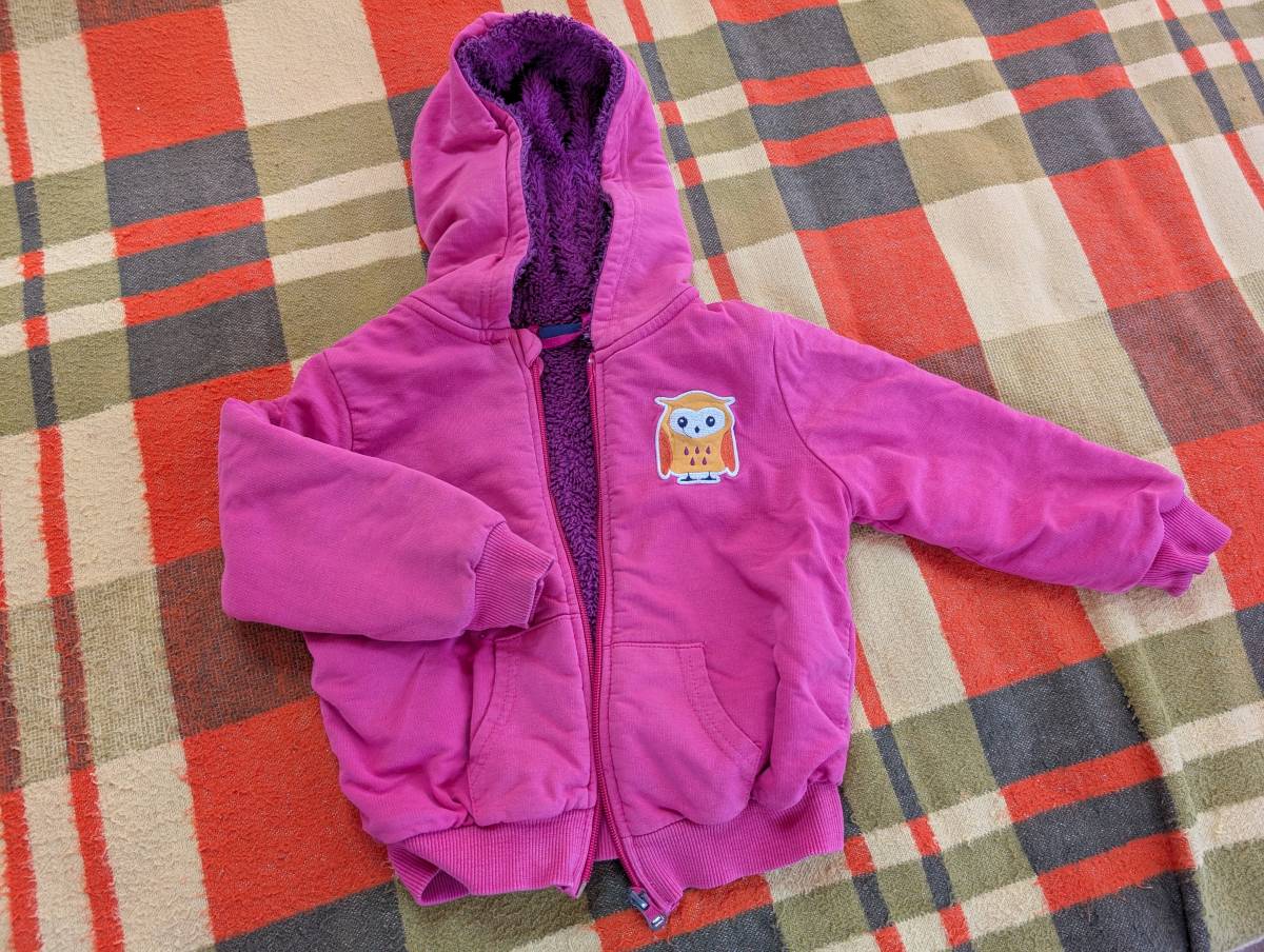 Daruji za odvoz dívčí mikinovou bundu Lupilu s obrázkem sovičky. Má kapuci, 2 kapsy, zapínání na zip. Vnější strana jako mikina, uvnitř hřejivý kožíšek.