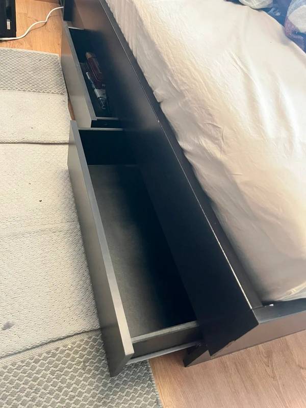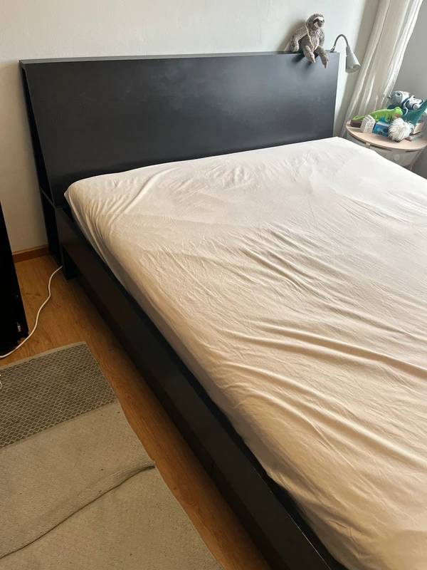 Starší postel, ale pořád funkční, místy odřená (vidno z fotek), barva černohnědá, lamino vzhled dřeva, čelo má po stranách police, z každé strany postele jsou dva šuplíky, na matraci o rozměrech 180x200 cm, BEZ roštů, BEZ matrací