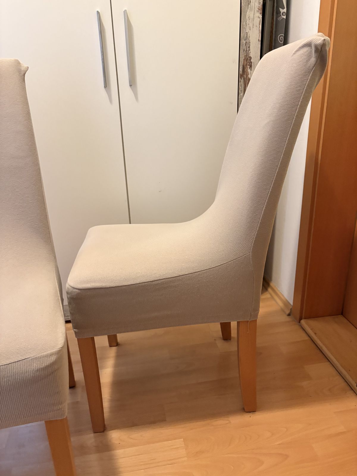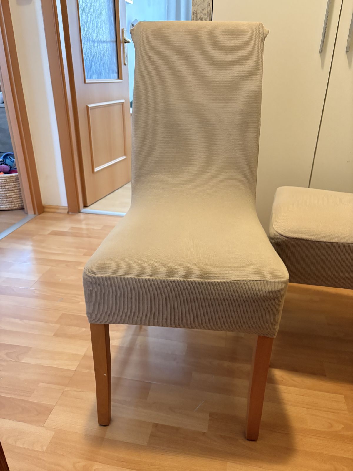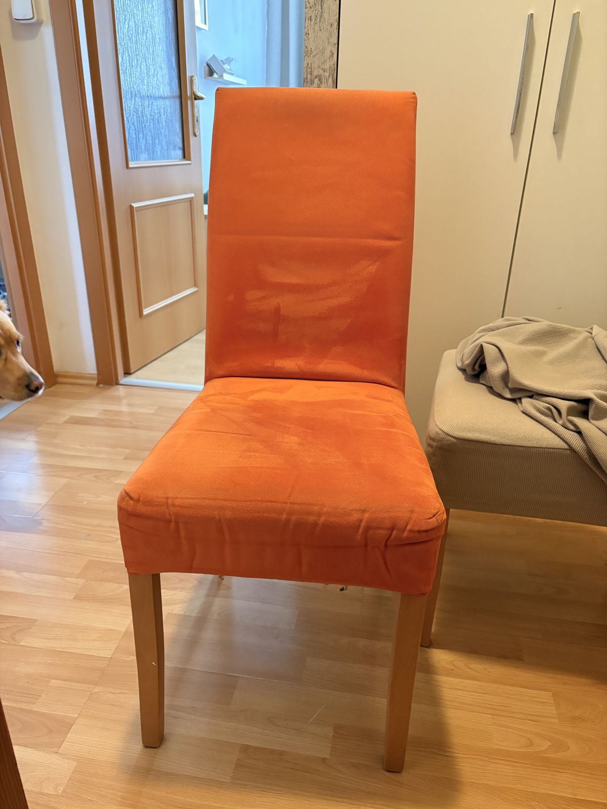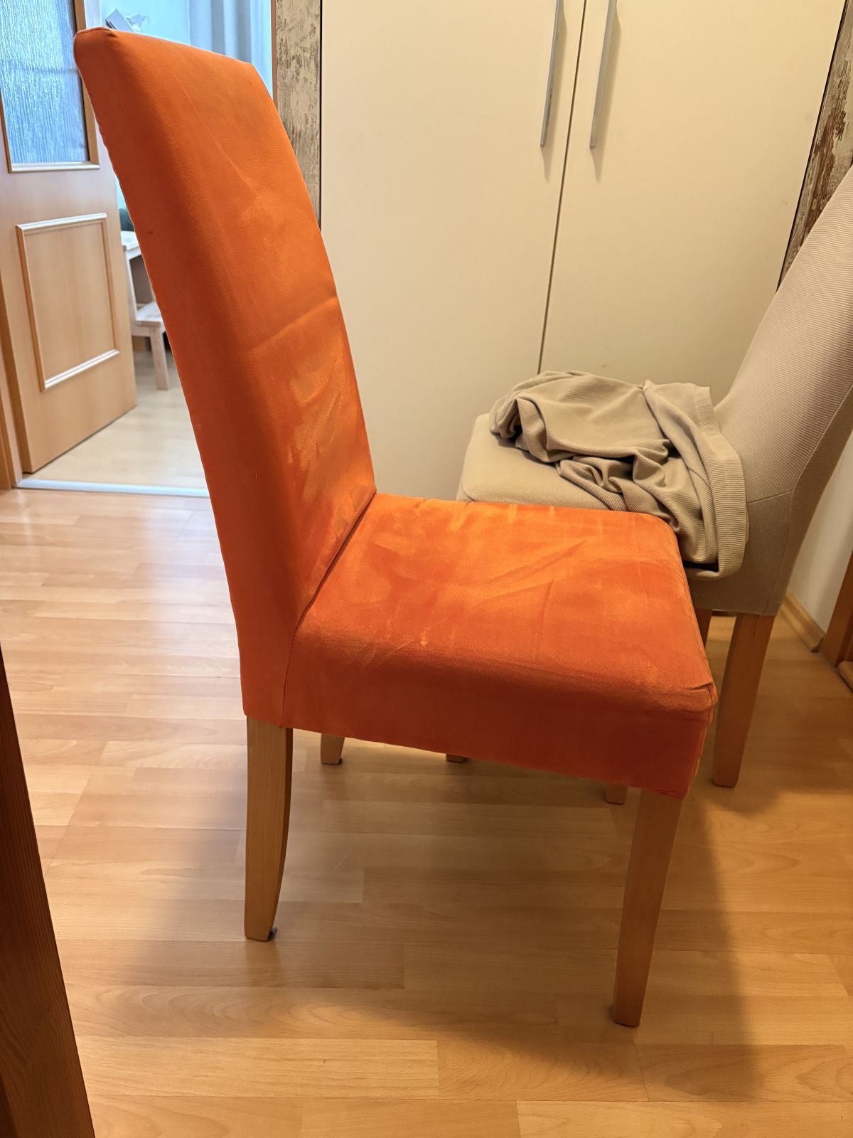 Daruji za odvoz 4 jídelní židle v dobrém stavu. Jsou dřevěné s polstrovanými měkčenými sedáky a opěrkami v oranžové barvě. K tomu věnuji 4 potahy v barvě šedé.