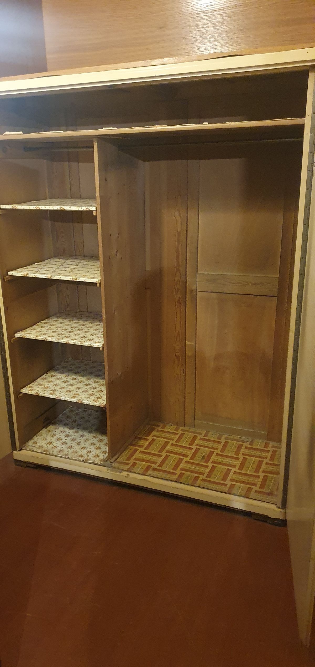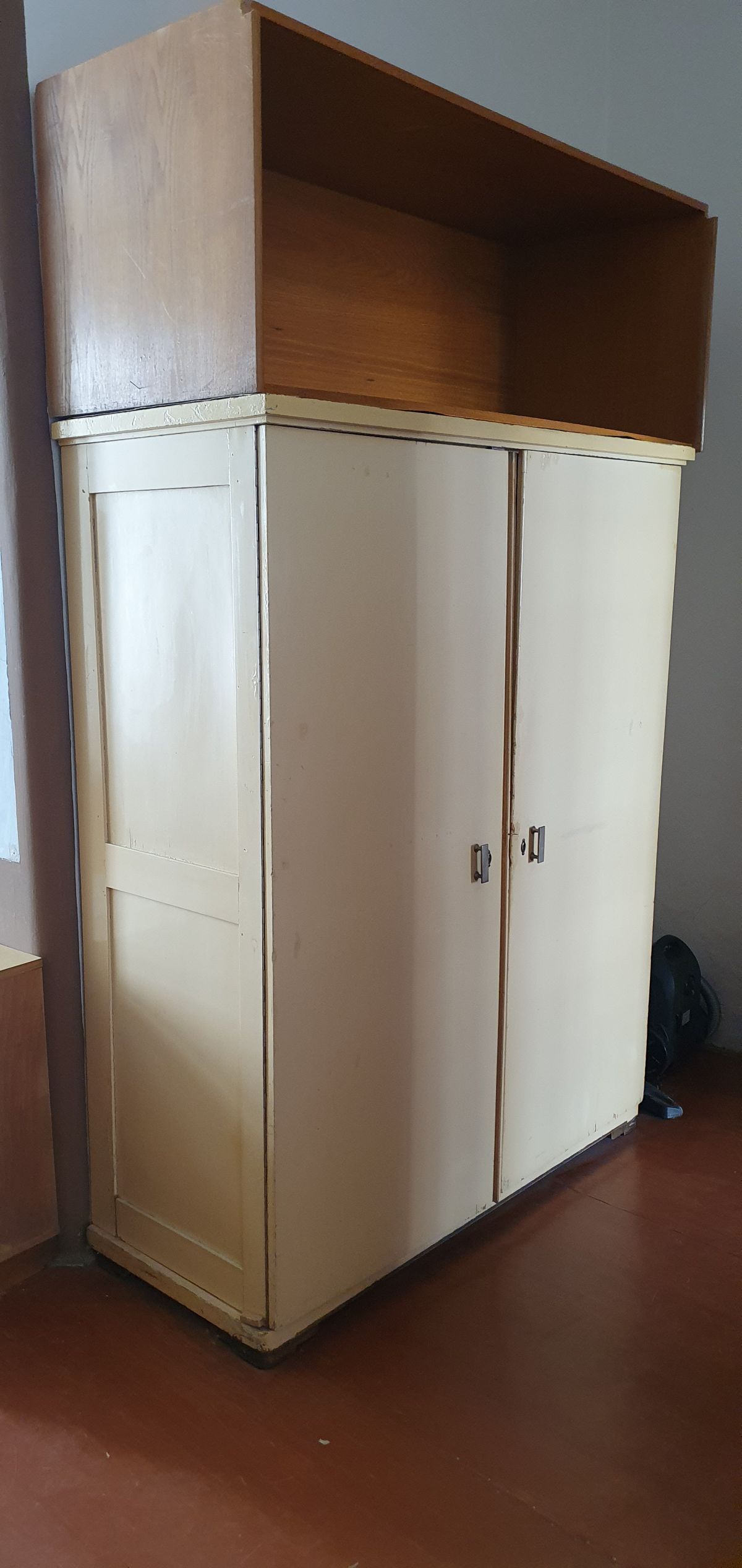 Daruji za odvoz - Stará dřevěná skříň k renovaci (kombinace police a ramínková tyč), lze bez nástavce š141, v183,5, h60,5. Nutný vlastní odvoz a naložení