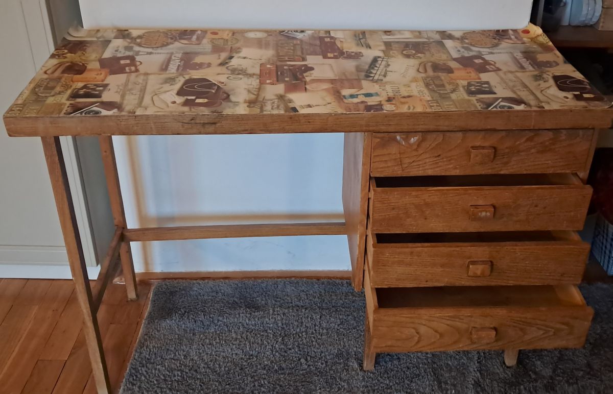 Daruji za odvoz studentský psací stůl, rozměry š. 145, hloubka 45, mořené dřevo ořech, výška 75, 4 šuplíky, nahoře samolepicí tapeta.