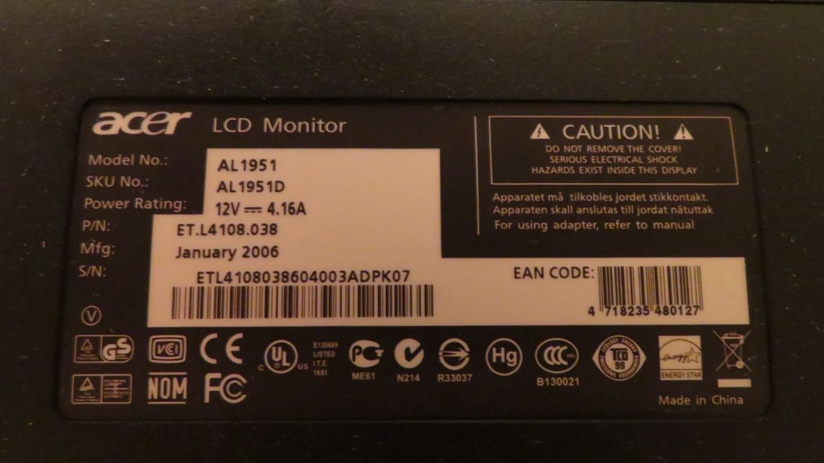 Daruji za odvoz Monitor Acer AL 1951. Je použitý, ale zcela funkční 19-palcový monitor s rozlišením 1280 x 1024 (SXGA).