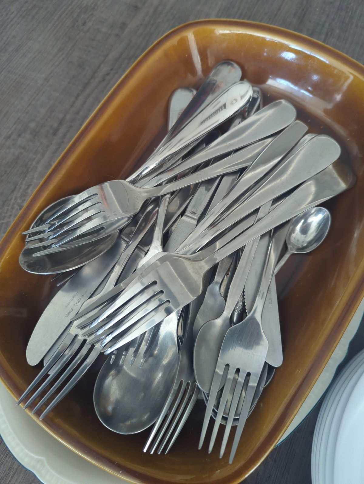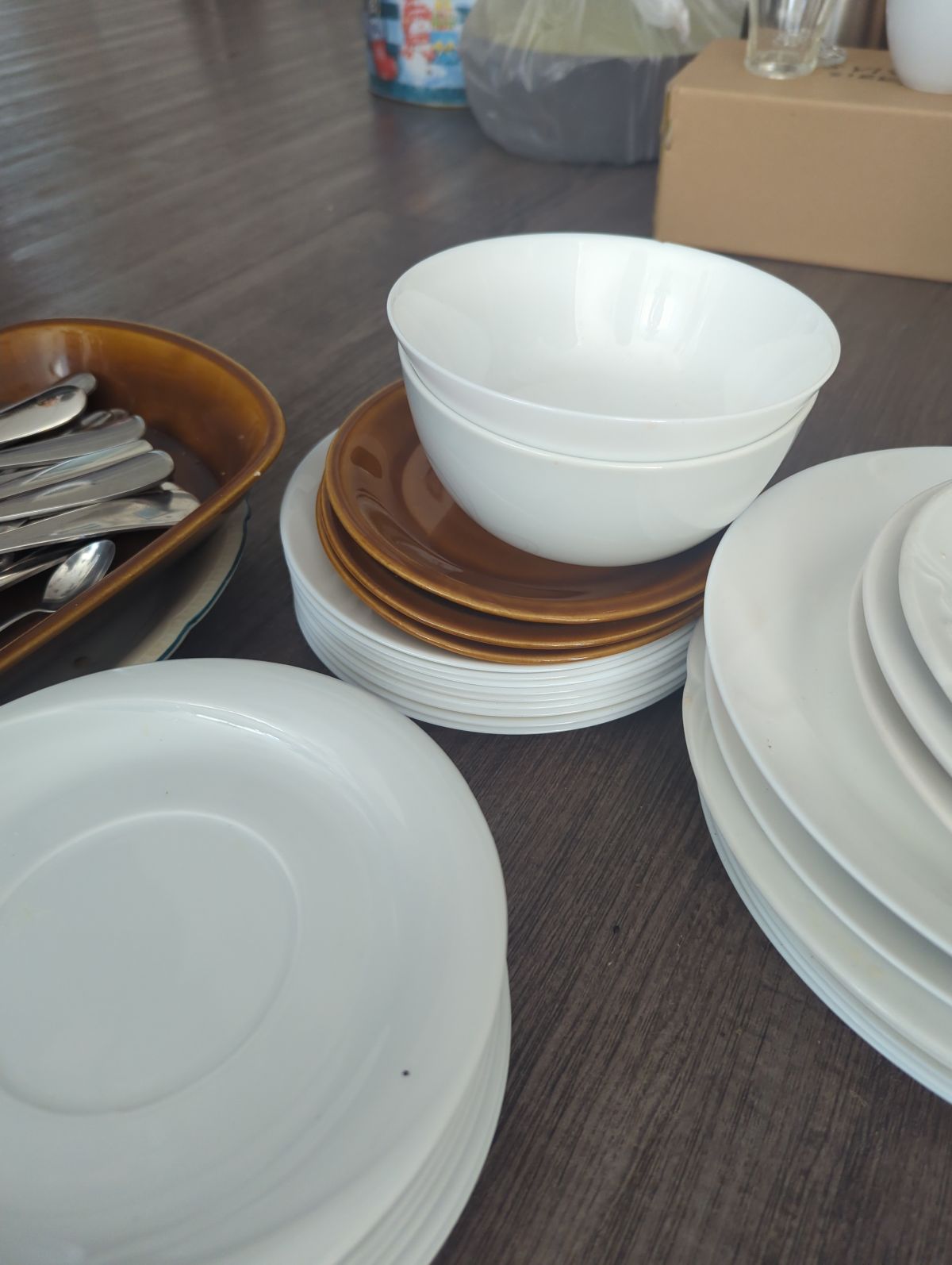 Daruji za odvoz cca 20 kusů různých talířů - hlavně velké a dezertní, dvě servírovací mísy, dvě misky, jeden hluboký talíř. Cca 30 kusů různých nerezových příborů, lžíce, lžičky, vidličky i nože.