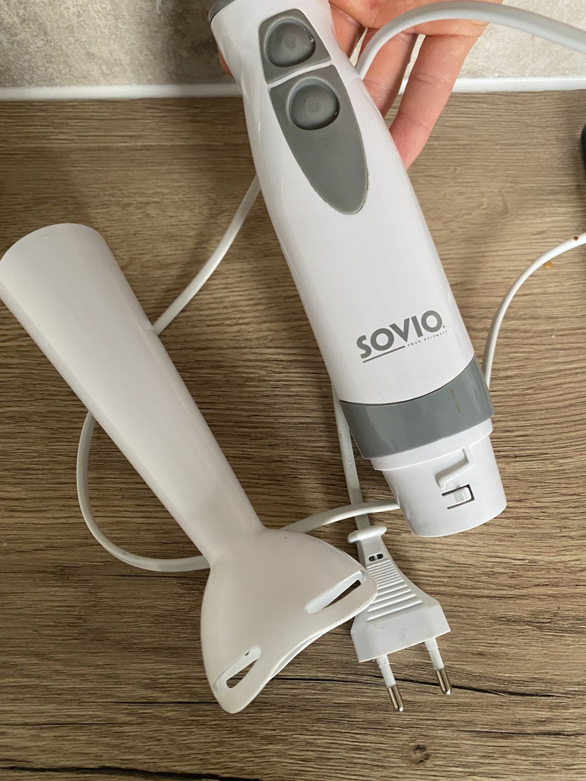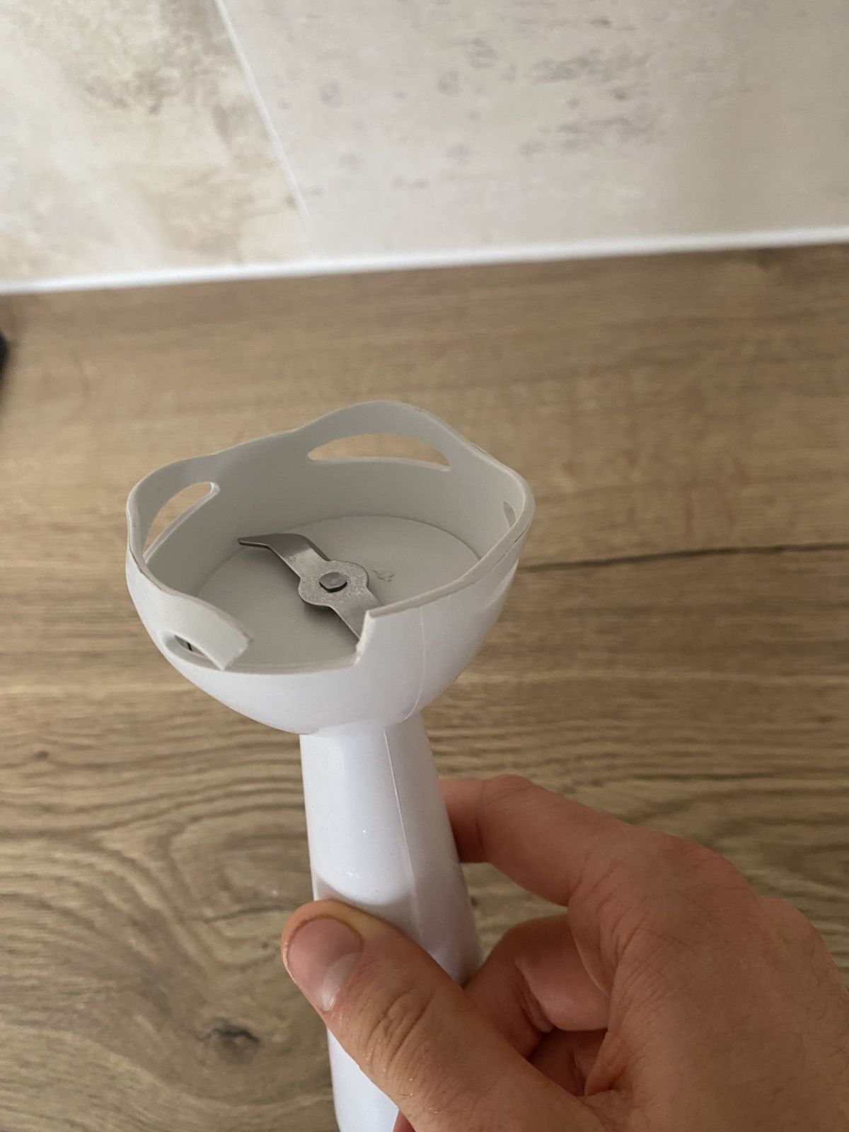Mixér funguje ale není v moc dobrém stavu (viz foto 2). Tyč spojující motor se sekáčky není 100% pevně upevněná, takže při mixování vydává zvuk (volnost je malá, ale i tak je to celkem hlasité).