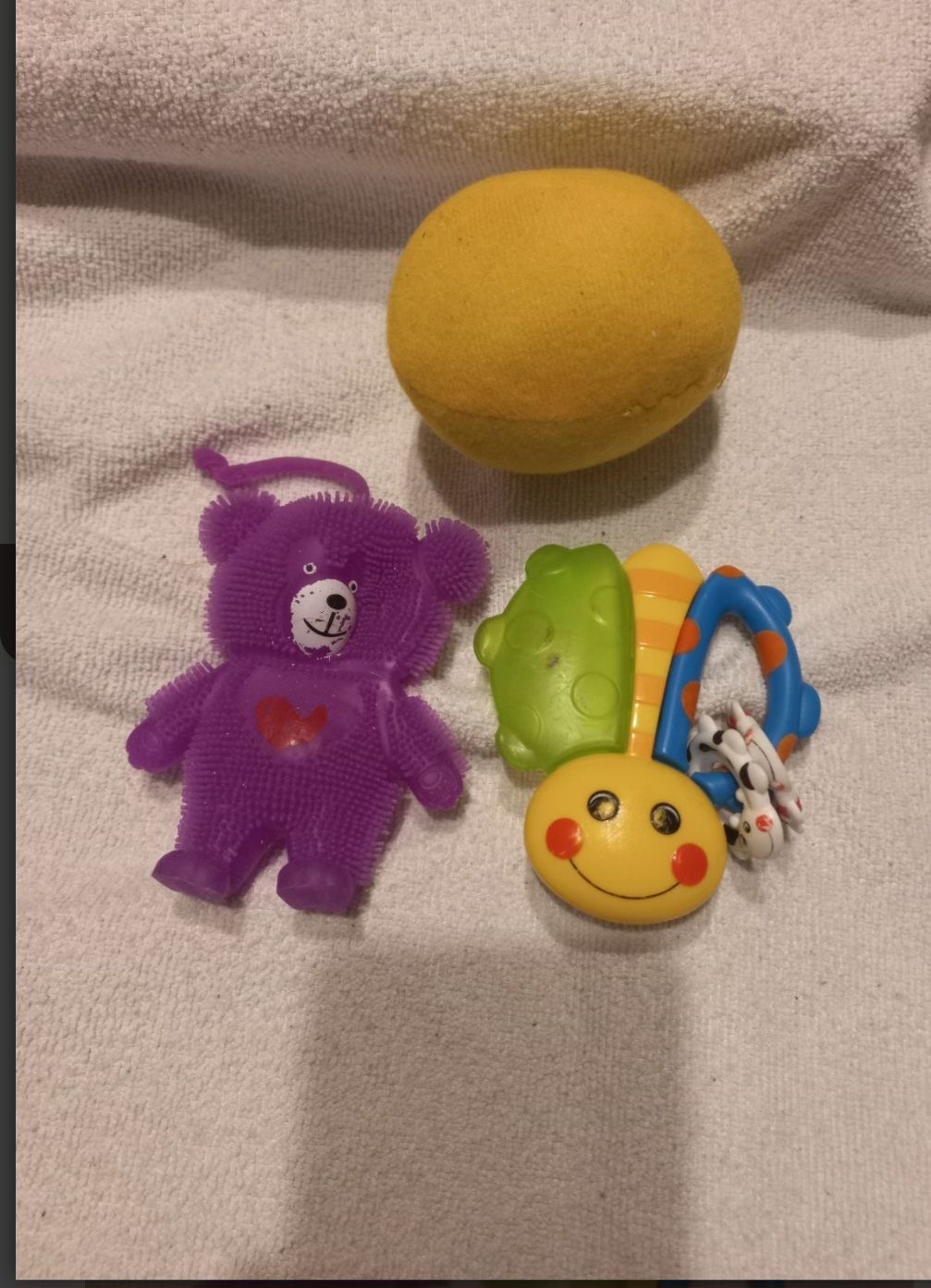 Daruji za odvoz chrastítko beruška, žlutý měkký pěnový balonek, krásný gumový fialový medvídek. U nad již nevyuzijeme. Třeba někomu ještě udělají radost. Podívejte se na mé další nabídky