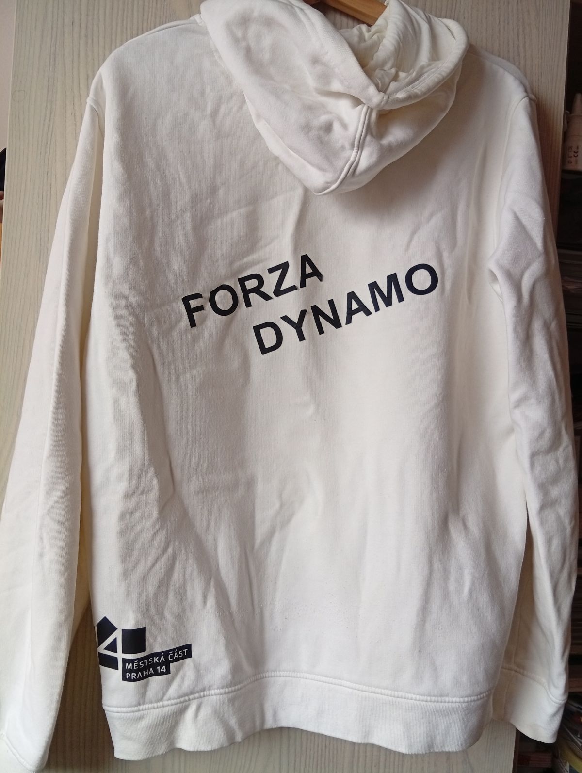 Bavlněná mikina od Městské části Praha 14. Velikost L. Trochu zažloutlý límec. Asi dá se vyprat. Jinak je ve velmi dobrém stavu.