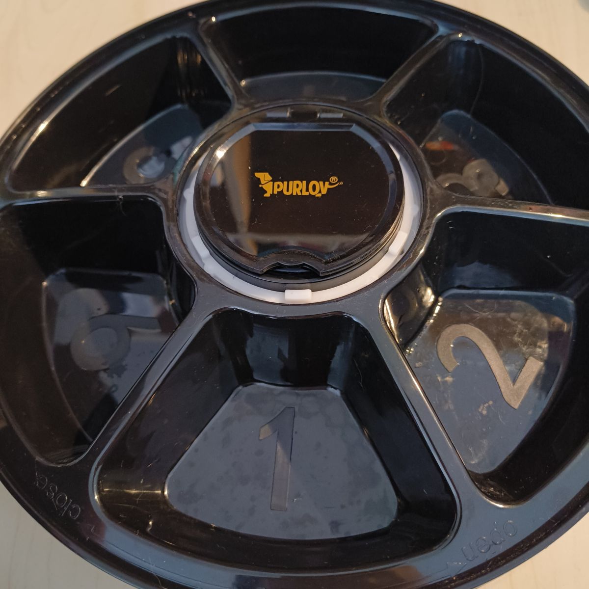 Daruji za odvoz Dávkovač krmiva Purlov, černý, moc nepoužívaný. Zkoušel jsem ho, ale má kočka z něj nejí. Vhodný na granule a jiné trvanlivější jídlo - není neprodyšný. Princip je jednoduchý, 6 přihrádek a automatizované otáčení mezi nimi po nastaveném čase.