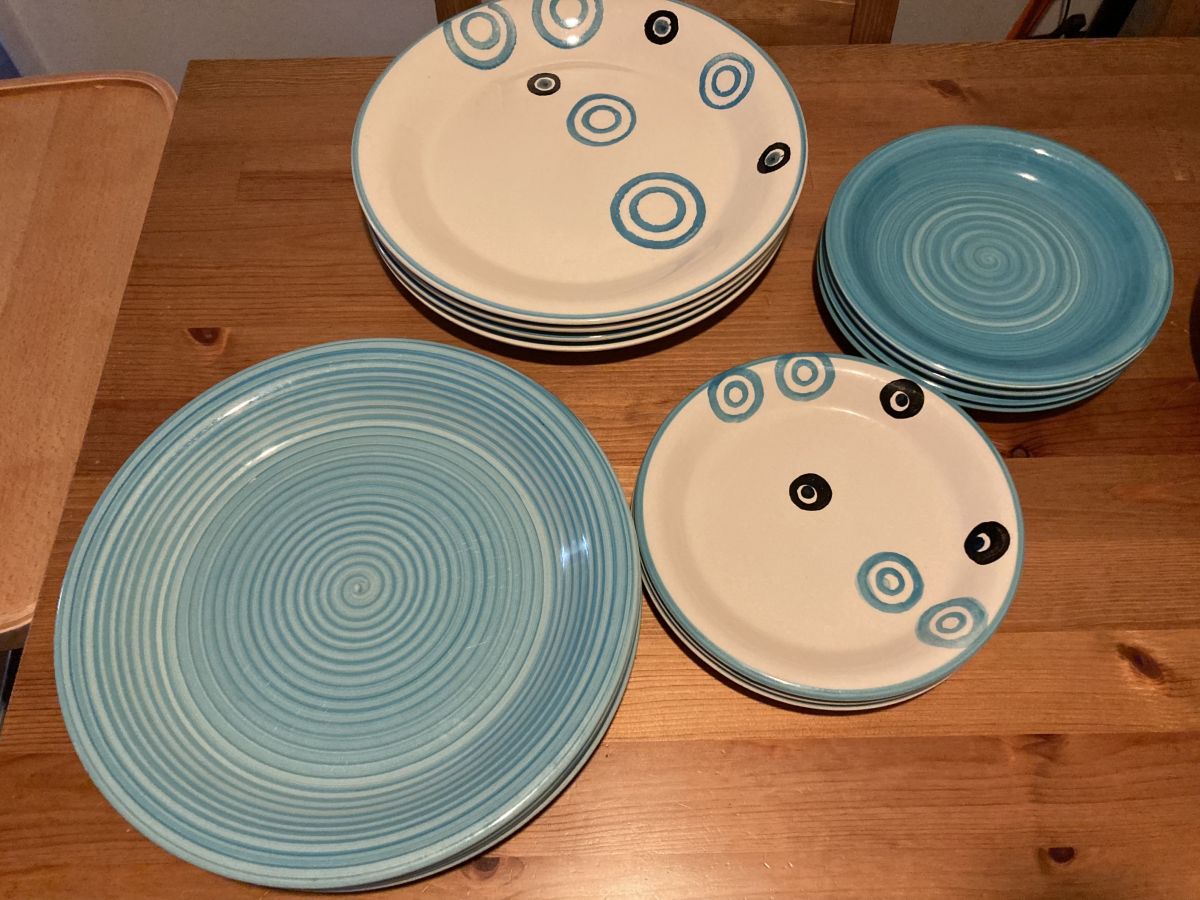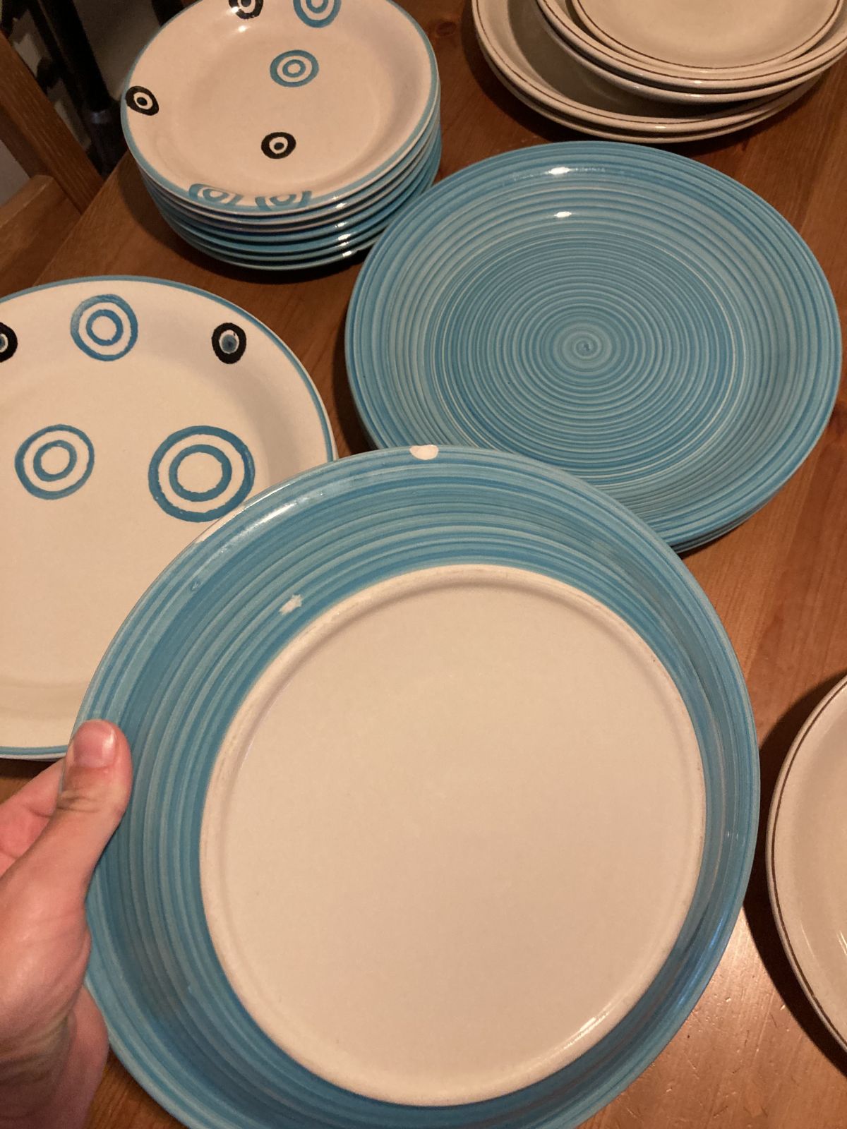 Daruji za odvoz neúplnou sadu mělkých keramických talířů: 8 ks velkých, 7 ks menších. Jeden malý a jeden velký mají zespoda trochu uštípnuto viz foto. Značku nevím.