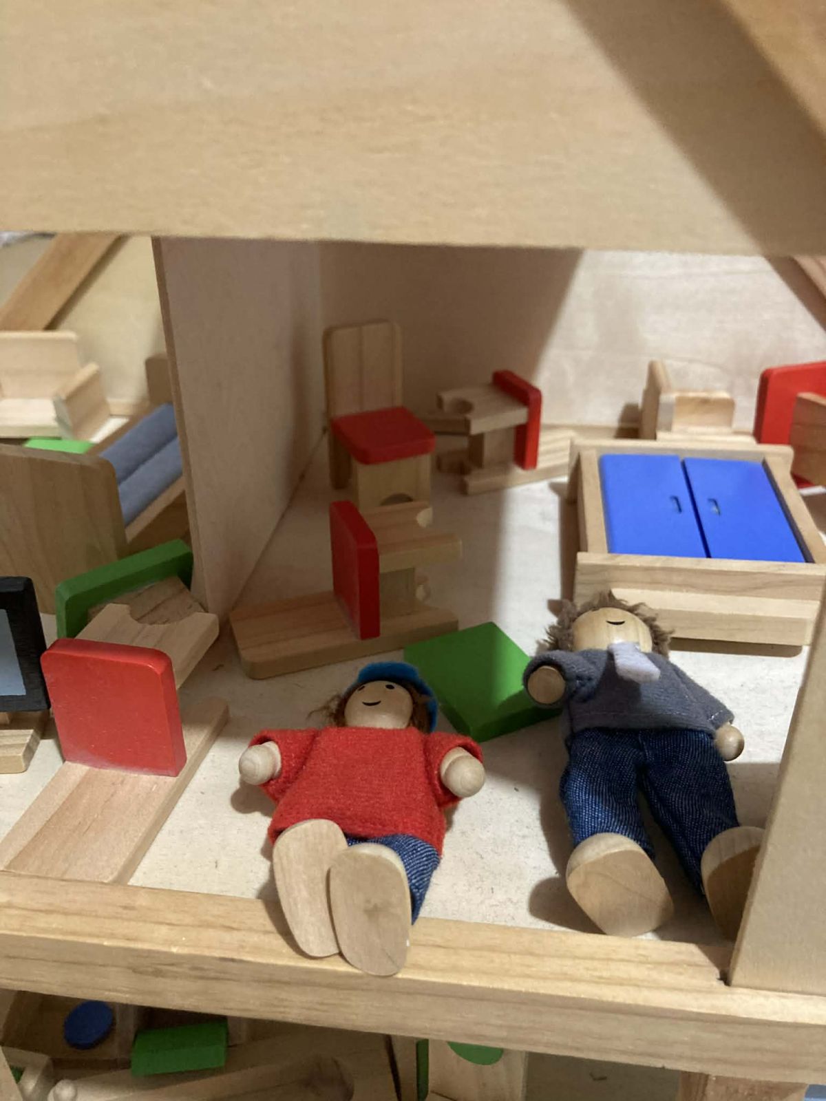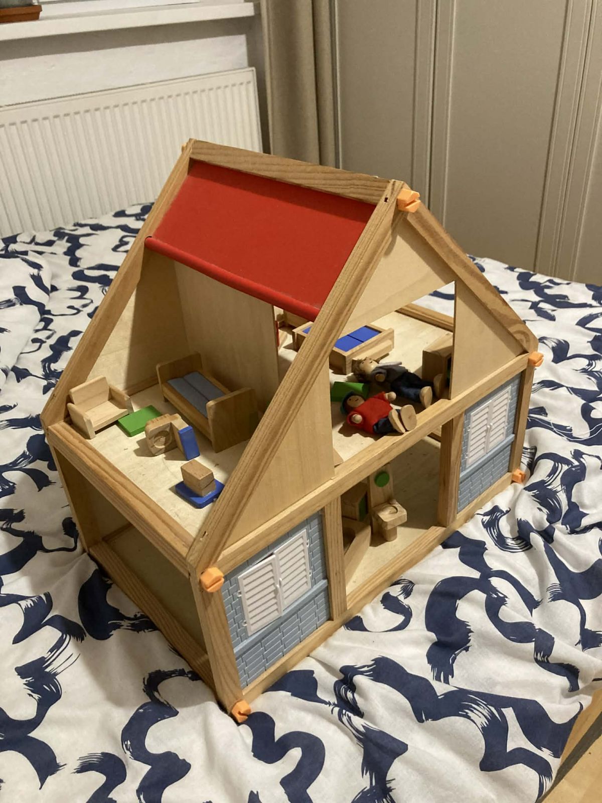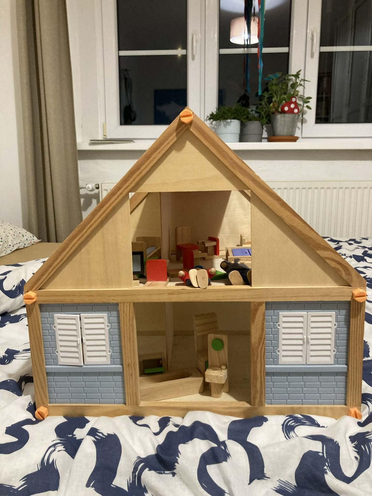 Daruji za odvoz dřevěný domeček pro panenky, vybavený dřevěným nábytkem a panáčky. :-) Na výšku má v nejvyšším bodě 44 cm, na šířku 46 cm.