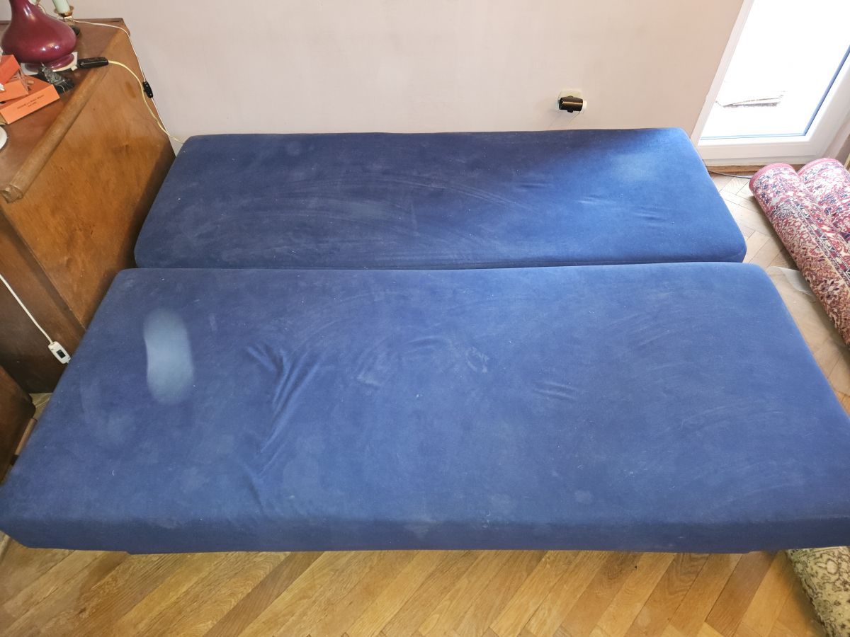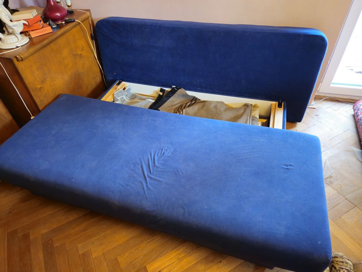 Daruji za odvoz rozkládací pohovku s úložným prostorem. Potah je lehce zaprášený (odstranitelné vysavačem) a jsou na něm 2 odstranitelné fleky. Nemám teď čas čistit, ale mám 100% jistotu, že půl hodina práce ji vrátí glanc. Já teď tu půl hodinu navíc nemám a proto ji nabízím za odvoz, i když je jinak ve velmi pěkném stavu. Potah není osezený, ošoupaný ani nic podobného. Konstrukce 100% původního.