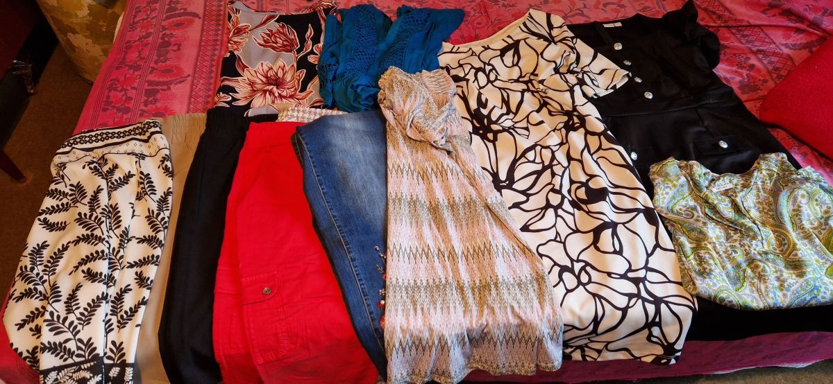 Nové, nebo málo nošené oblečení vel. 44-46 pro šik dámu 50+ let. Kalhoty, sukně, šaty, halenky,svetříky, 2x boty vel. 39. Neunosíme.