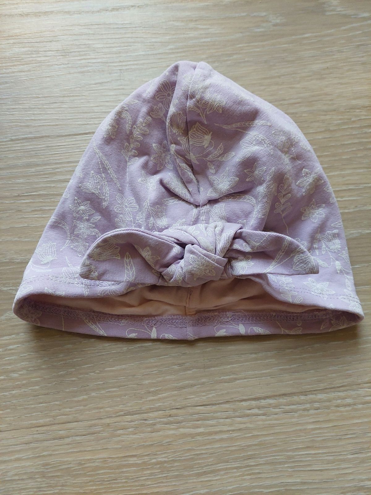 Fialová čepička s kvítky cca pro 1-2 letou holcicku