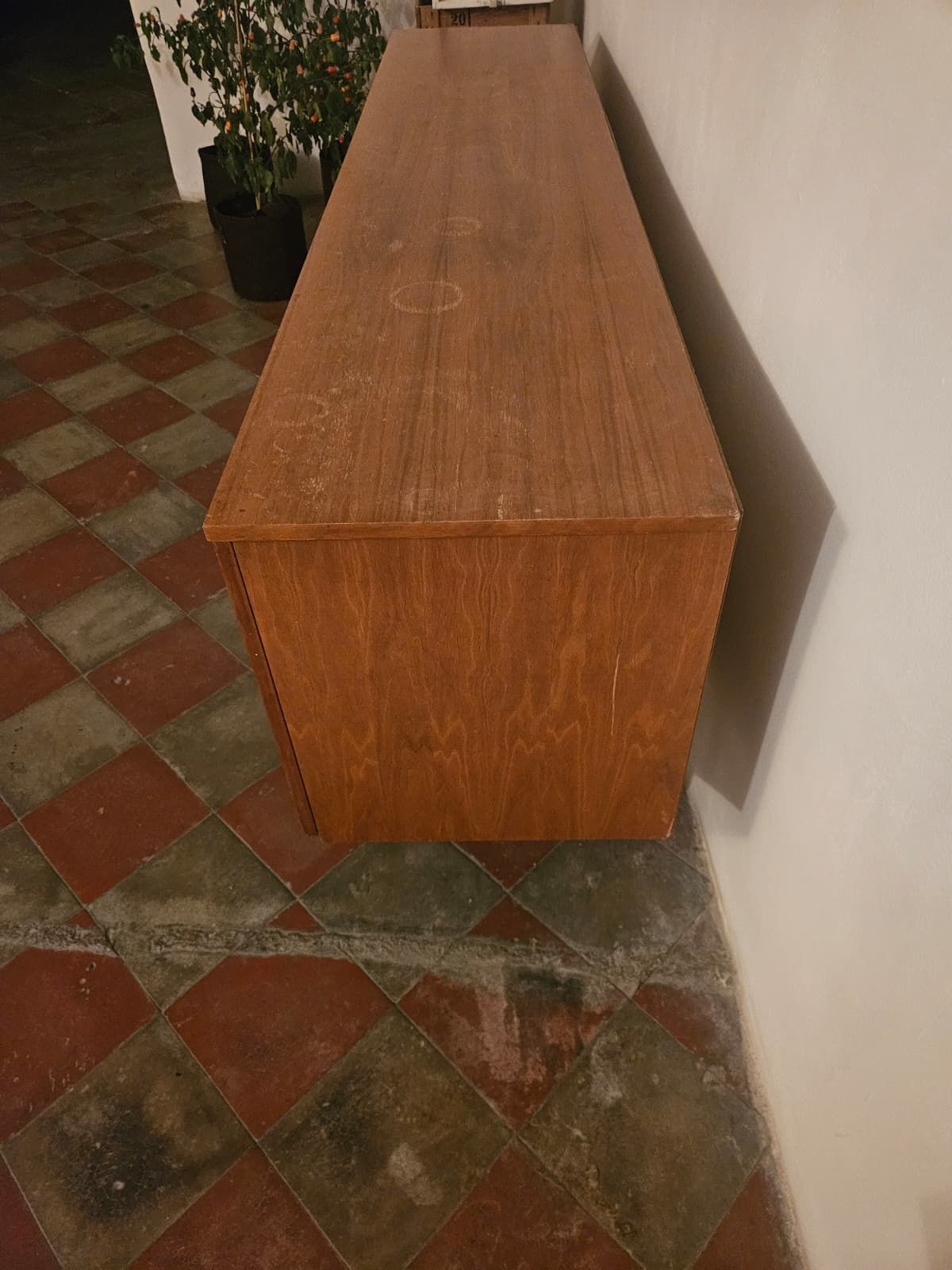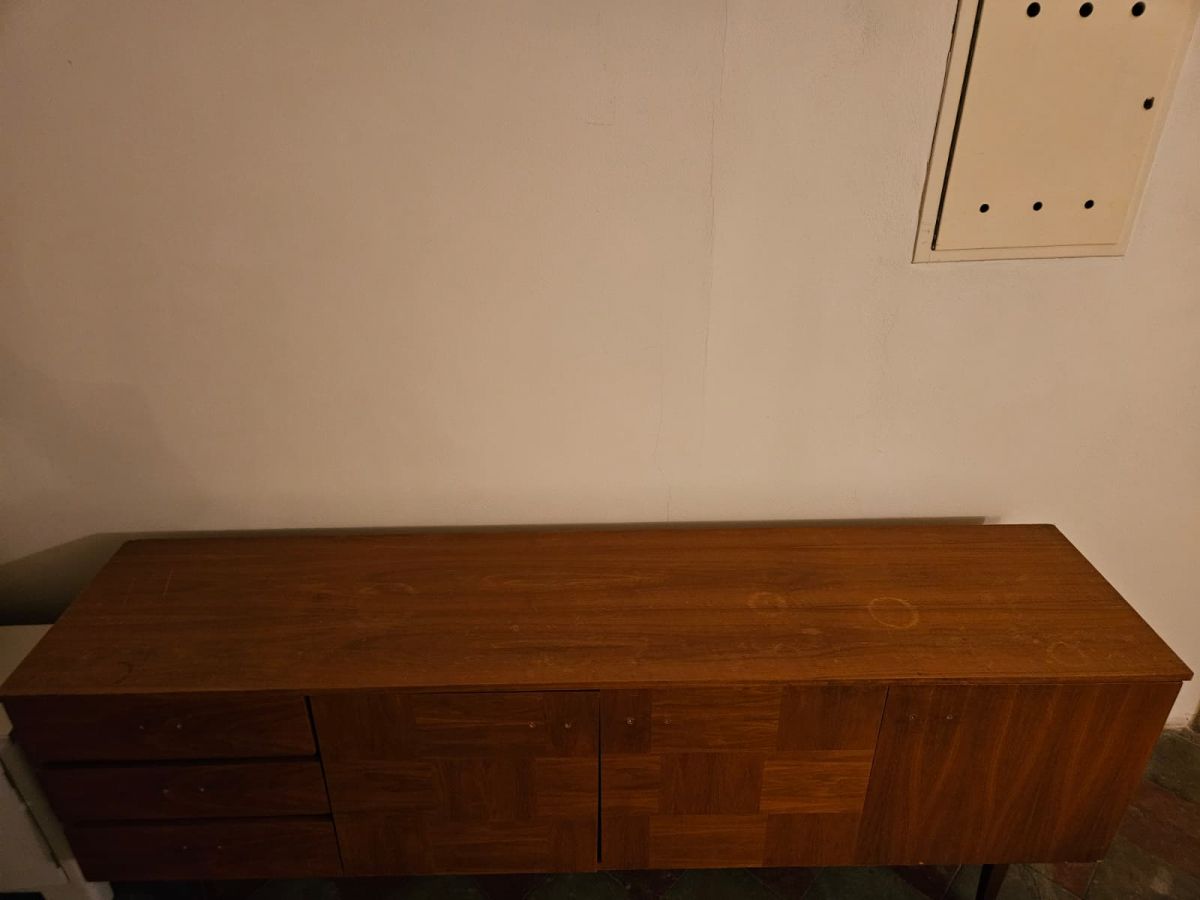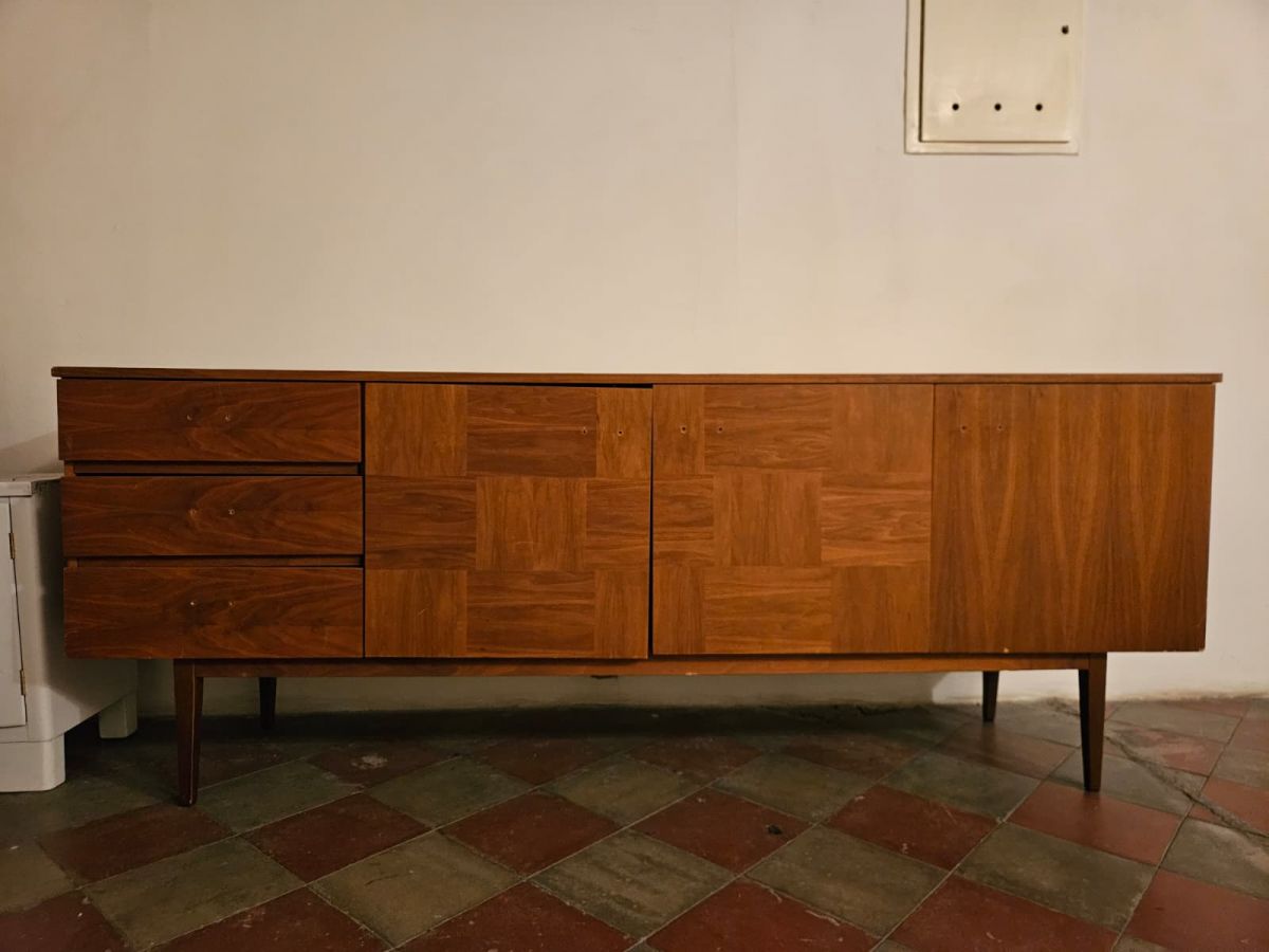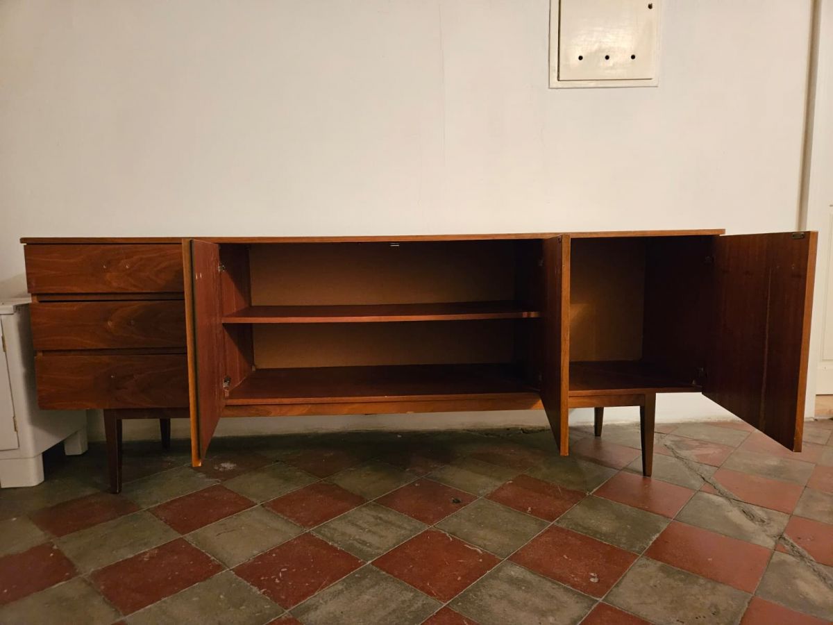 Daruji za odvoz komodu na nožičkách. Materiál dýha, rozměry 200x45x76 cm (do většího osobáku se vejde:). Místy poškozená, určená k repasi. Bez úchytek.