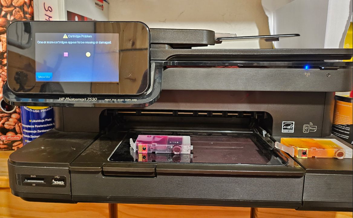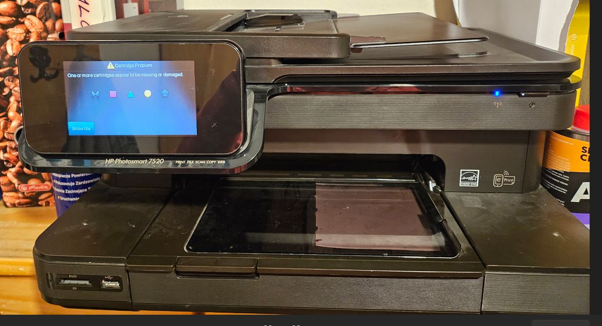 Daruji za odvoz tiskárnu hp photosmart 7520. Starší, do předvčerejška tiskla, ale když jsem se pokusila vyměnit cartridge, zahlásila chybu. Zřejmě update a nechce brát neoriginál cartridge. Všechny mimo žluté a jak vložím žlutou začne hlásit chybu všech viz foto. Třeba někdo využije s originál barvami, případně vrátit update. Vyzvednutí v Podolí.